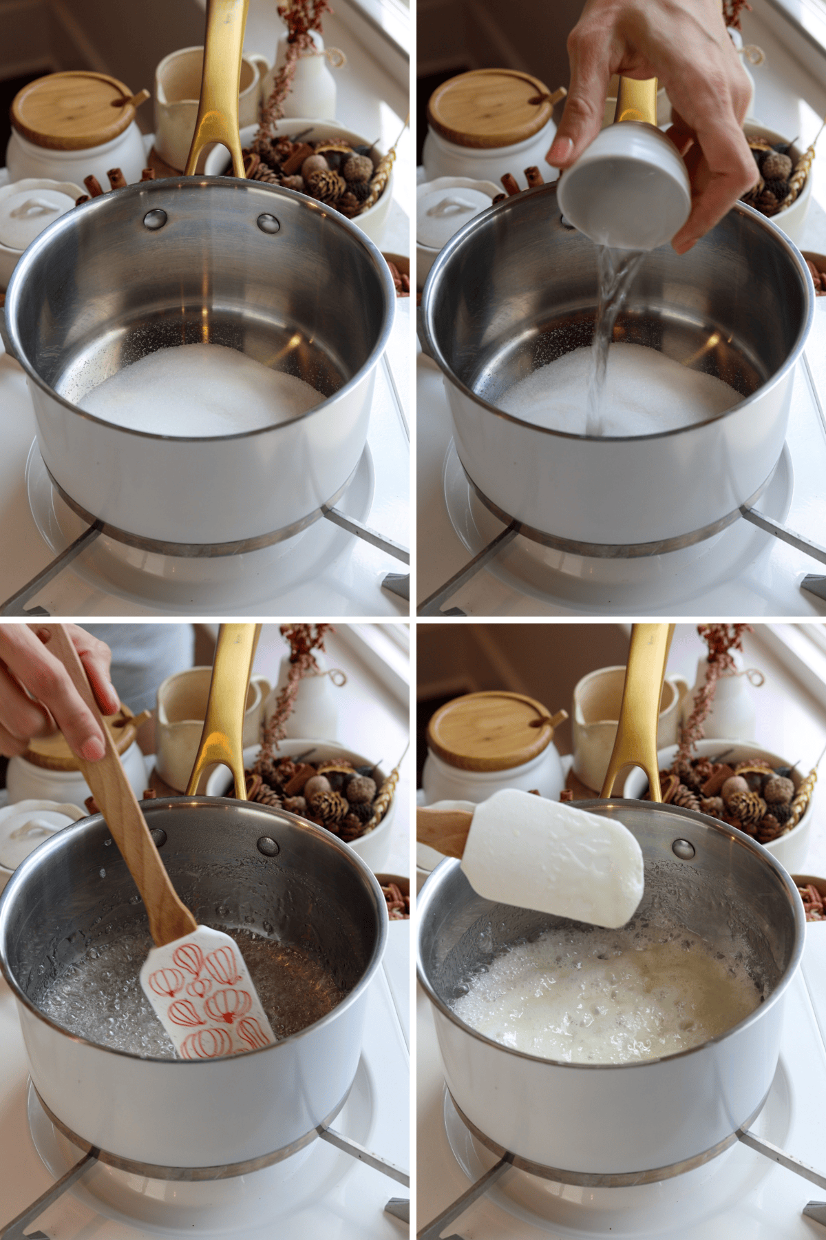 - Add the granulated sugar, butter, water, salt, and cinnamon (if using) to the same skillet and cook over medium heat, stirring occasionally, until the sugar dissolves and turns light amber, about 3โ5 minutes.