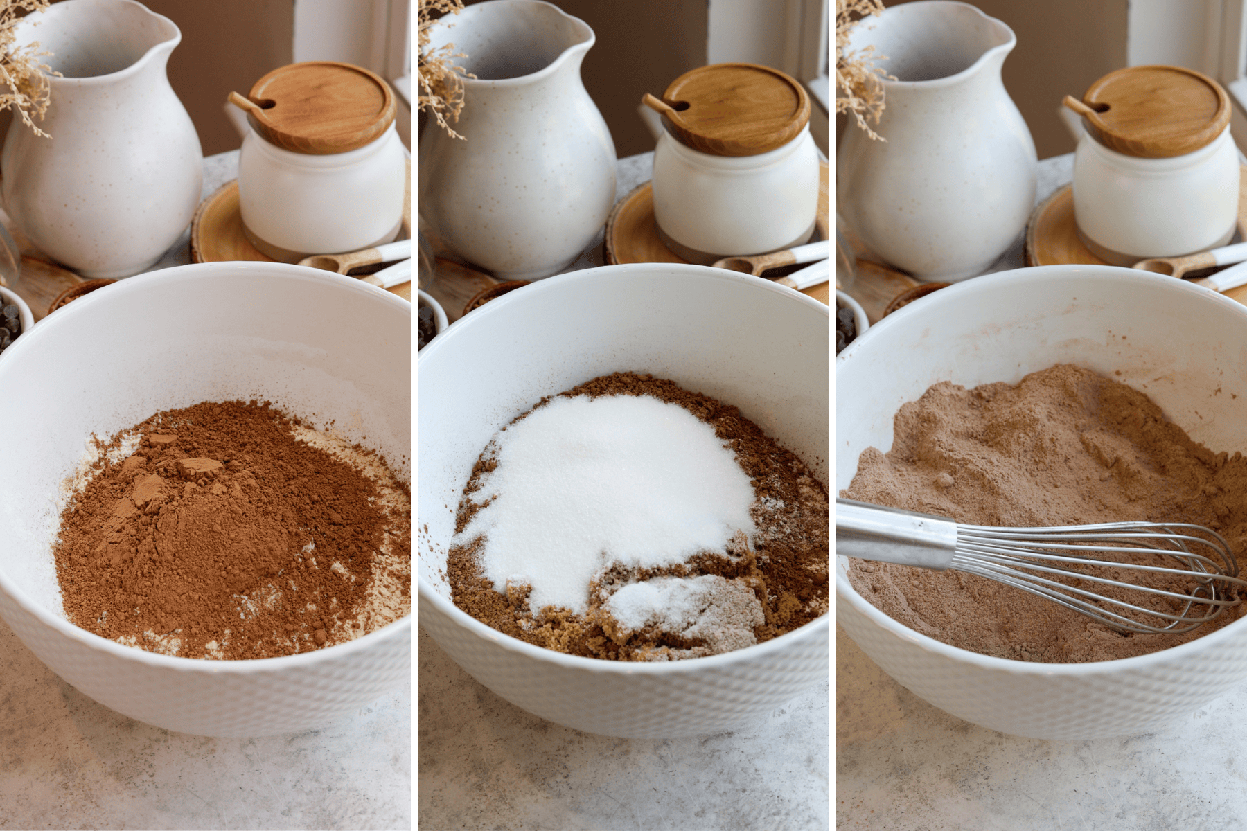 - In a large bowl, whisk the flour, cocoa powder, baking powder, baking soda, salt, espresso powder (if using), brown sugar, and granulated sugar until evenly combined.