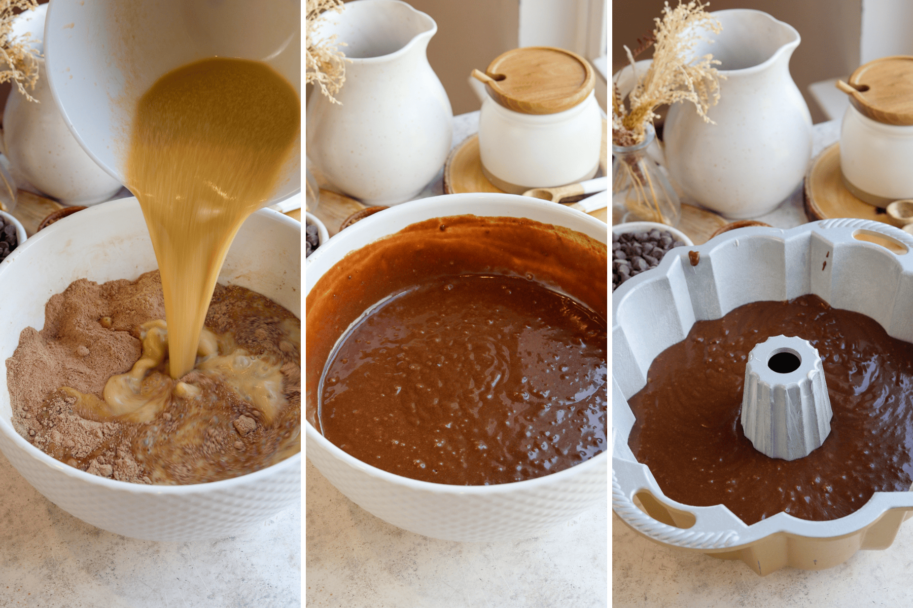 - In a separate bowl, whisk the melted butter, oil, eggs, buttermilk, coffee (or water), and vanilla until smooth.