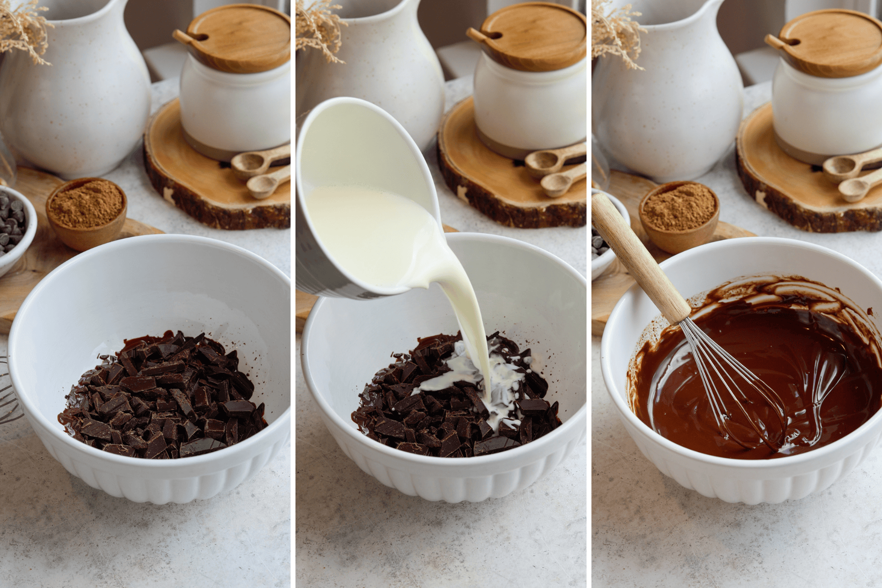 - Finely chop the chocolate and place it in a medium heat safe bowl. In a small saucepan, heat the heavy cream over medium heat until it just starts to simmer, with small bubbles forming around the edges. You can also heat it up in the microwave. Be careful so it doesnโt boil over.