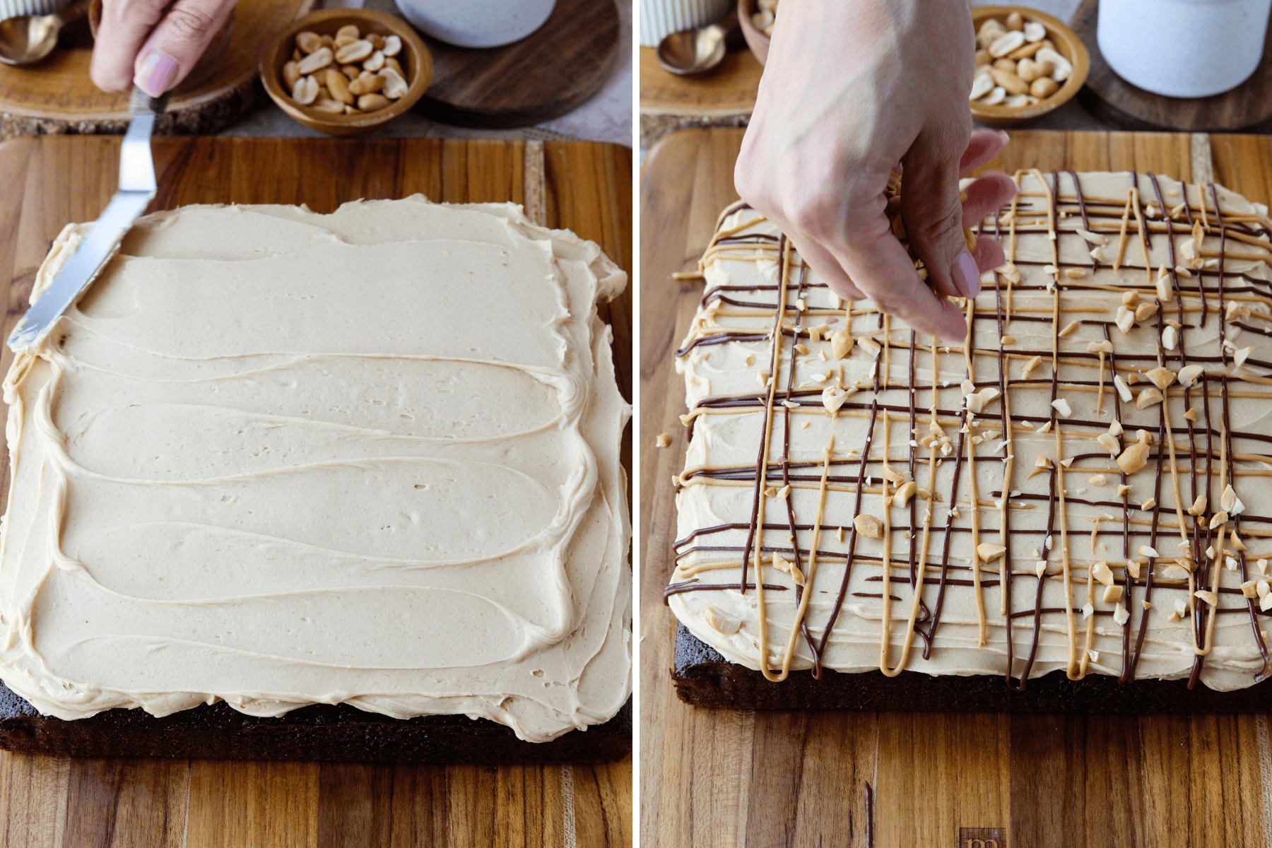 - Drizzle the peanut butter and the chocolate ganache over the cake, and top with chopped peanuts.