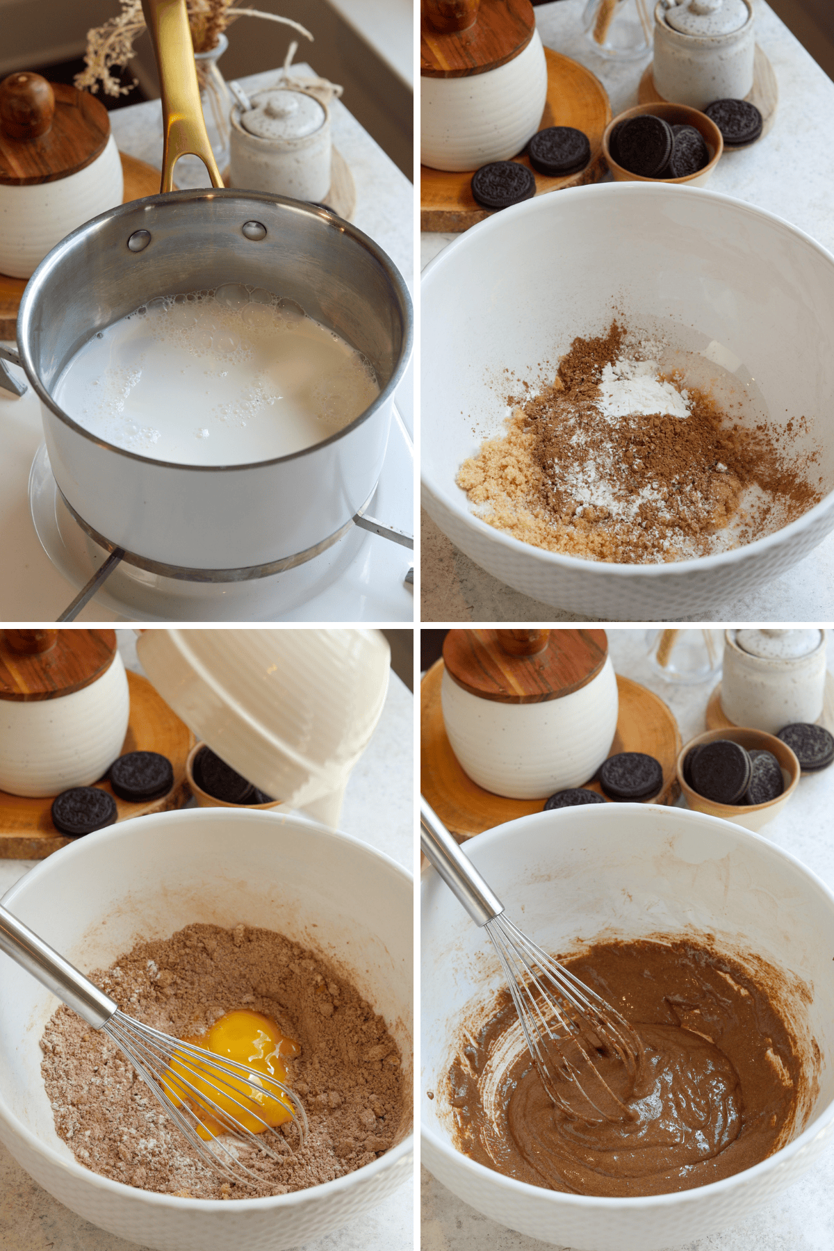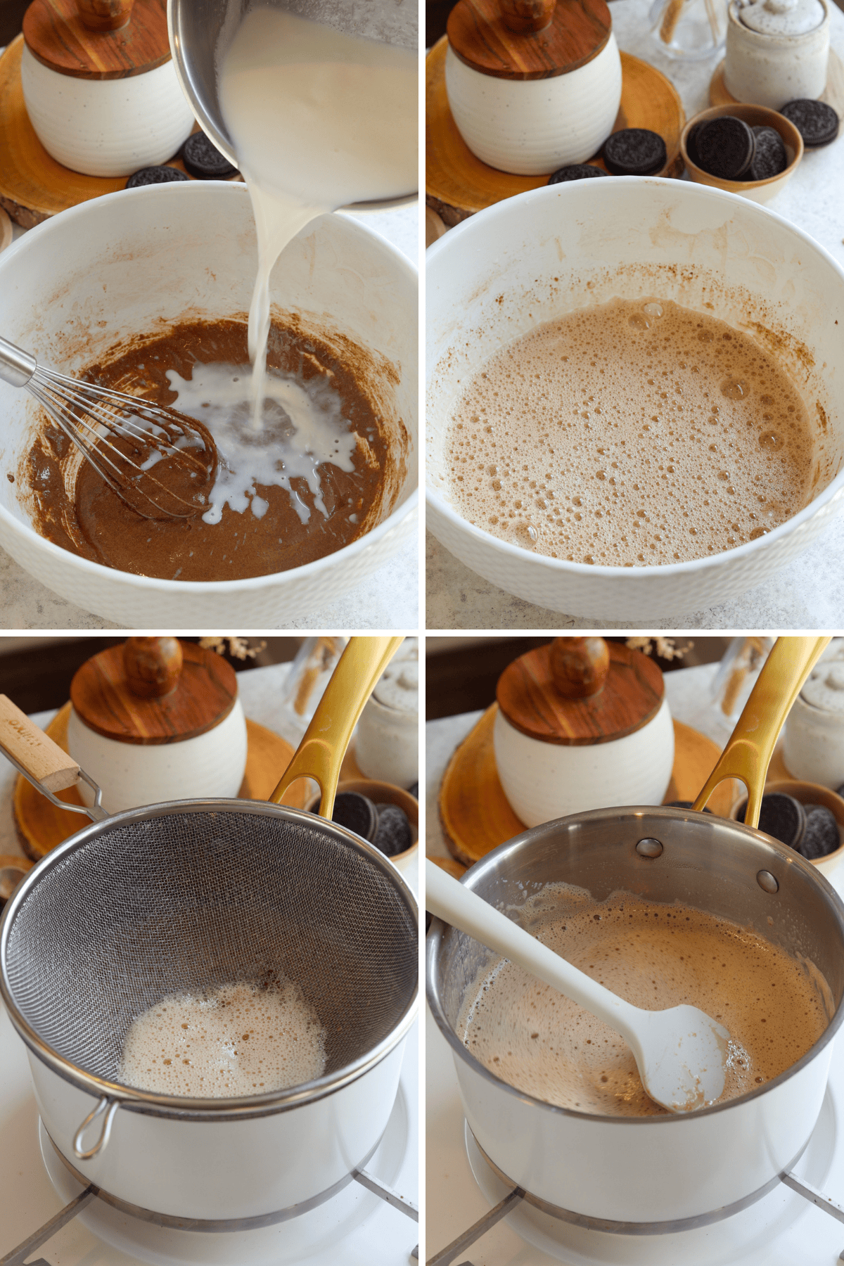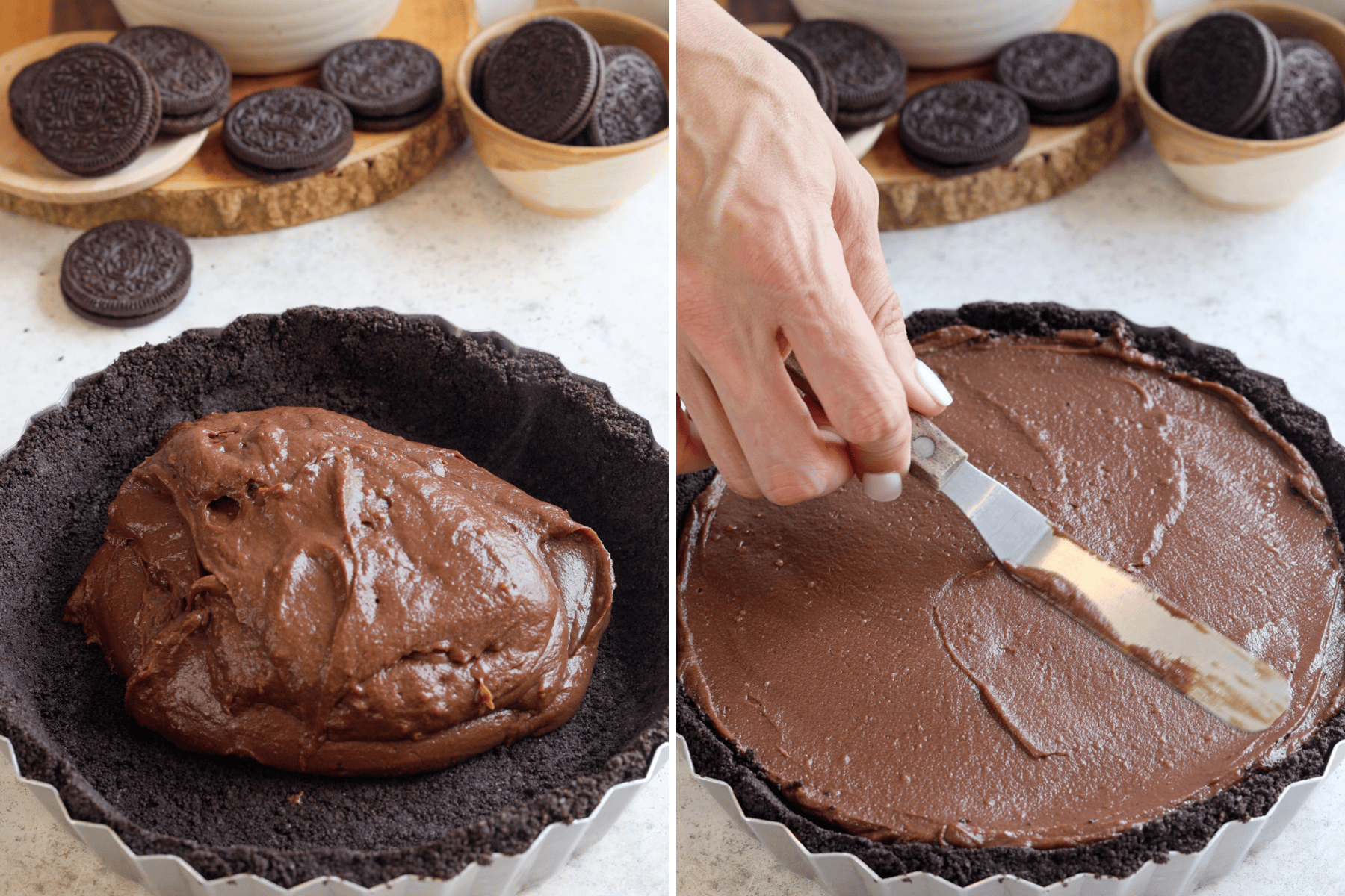 The filling is cooked carefully to avoid lumps, then poured into a chilled pie pan lined with a homemade Oreo cookie crust. Once set, the whole pie slices cleanly with a beautiful layered cross-sectionโrich chocolate base, creamy top, and a buttery, crunchy crust.