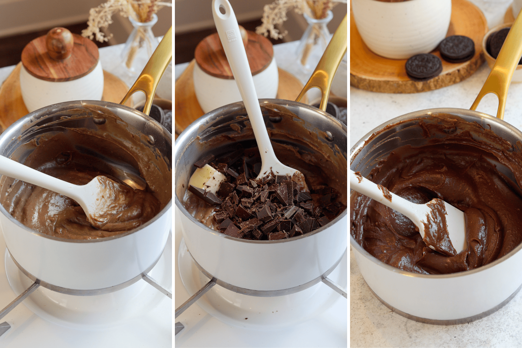 - Once the mixture is very thick, remove from the heat. Add the chopped chocolate and the butter. Stir until completely incorporated.