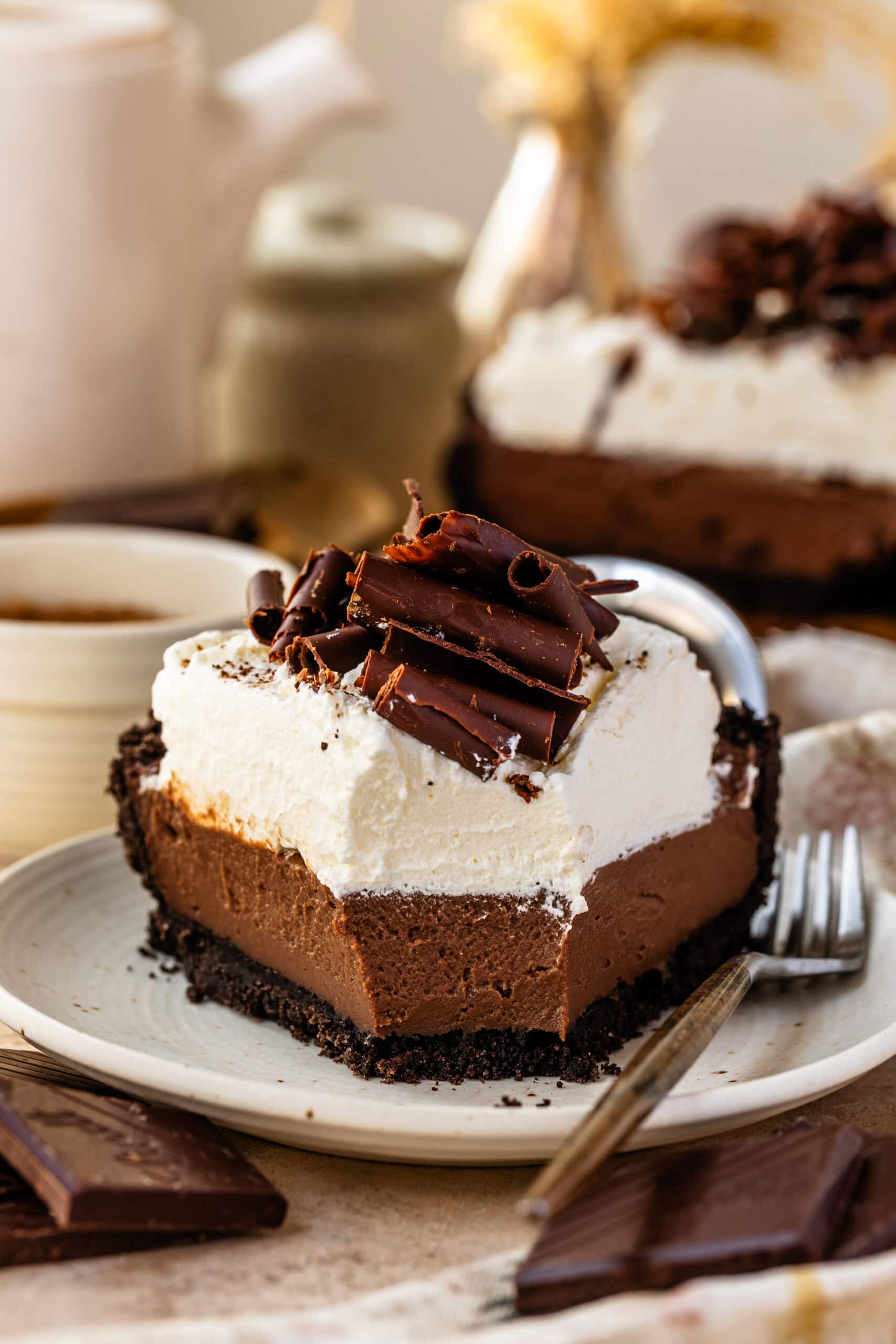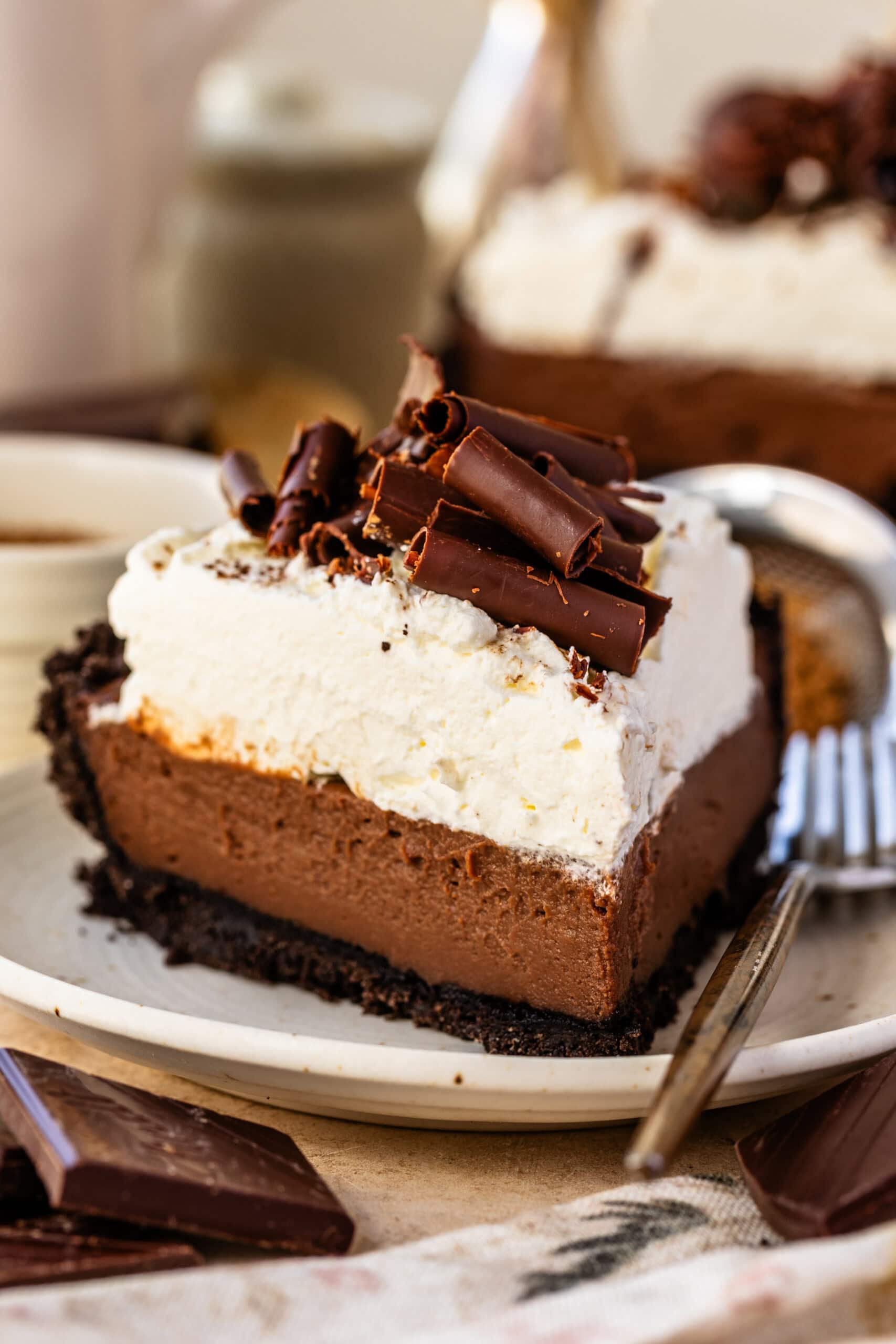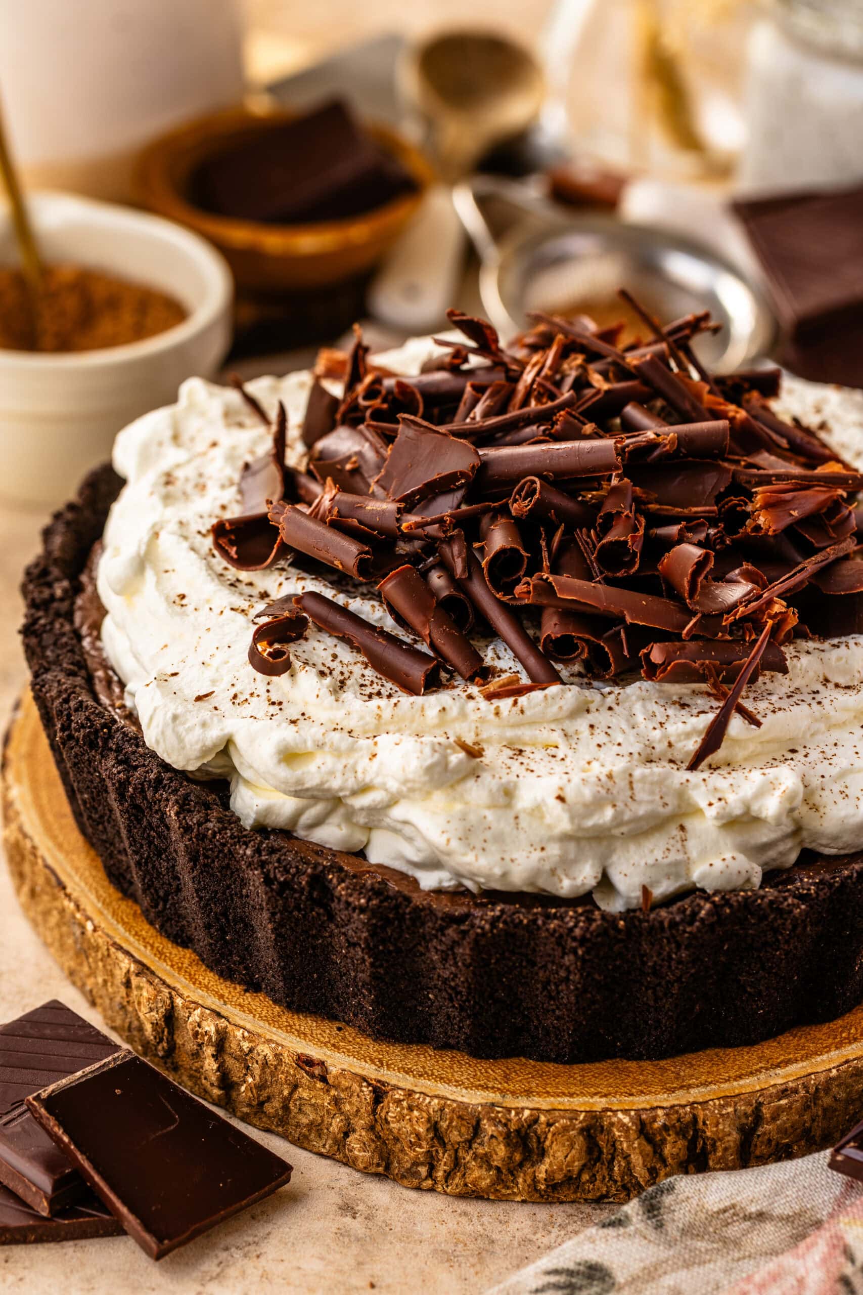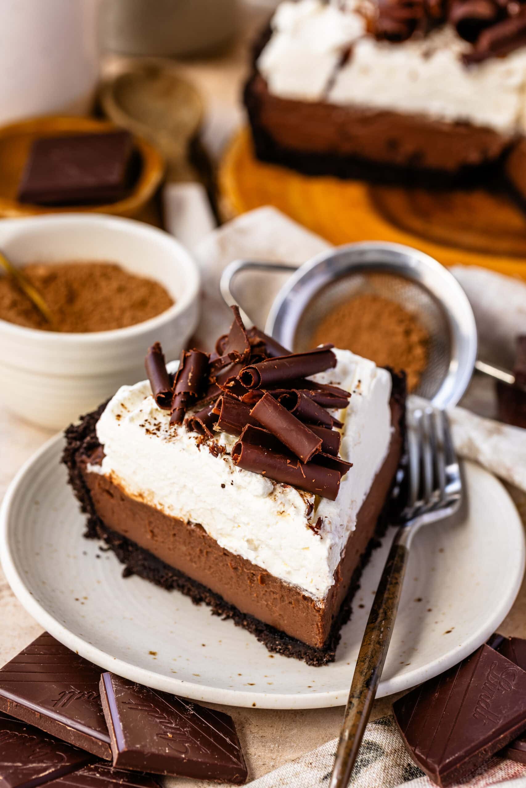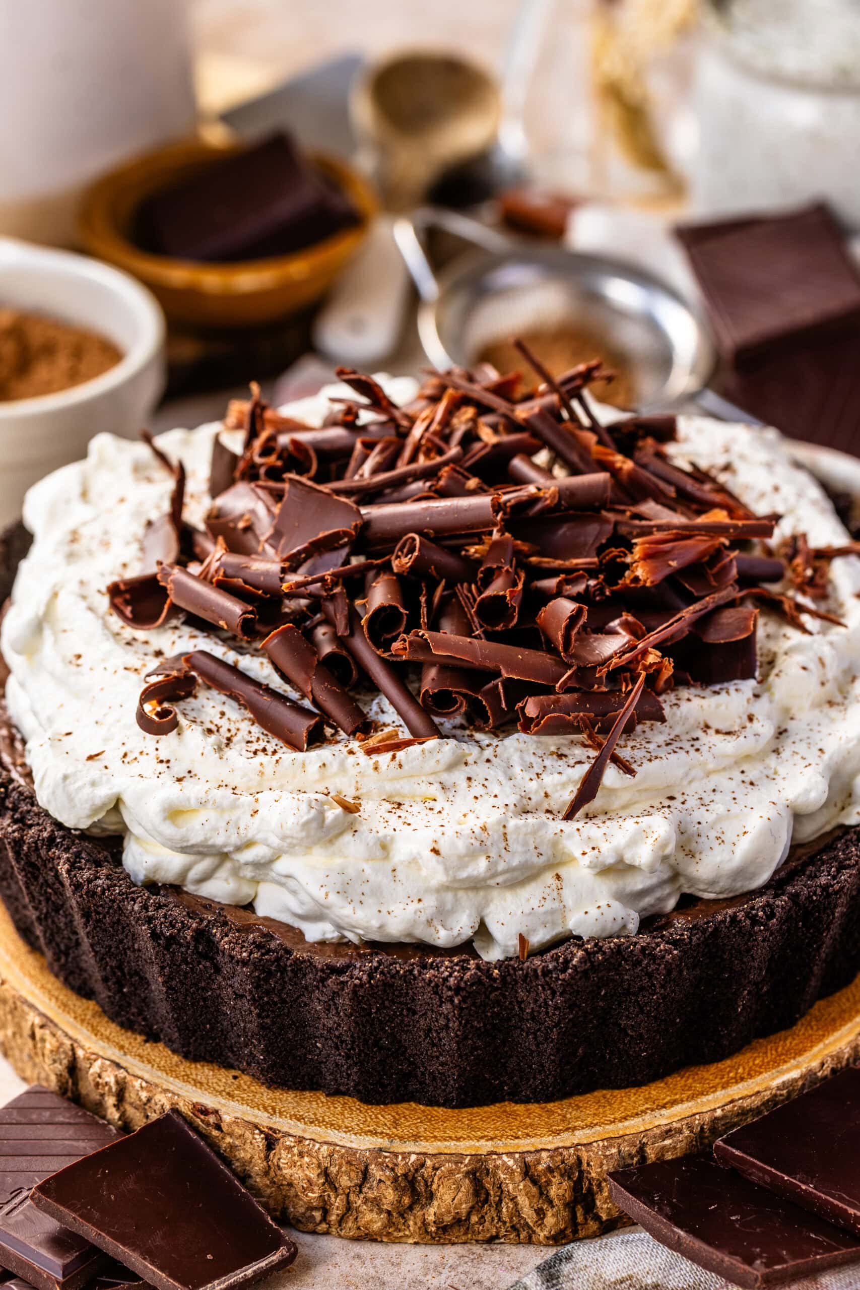 - Spread or pipe the whipped cream over the chilled pie. Decorate with chocolate curls or chocolate chips!