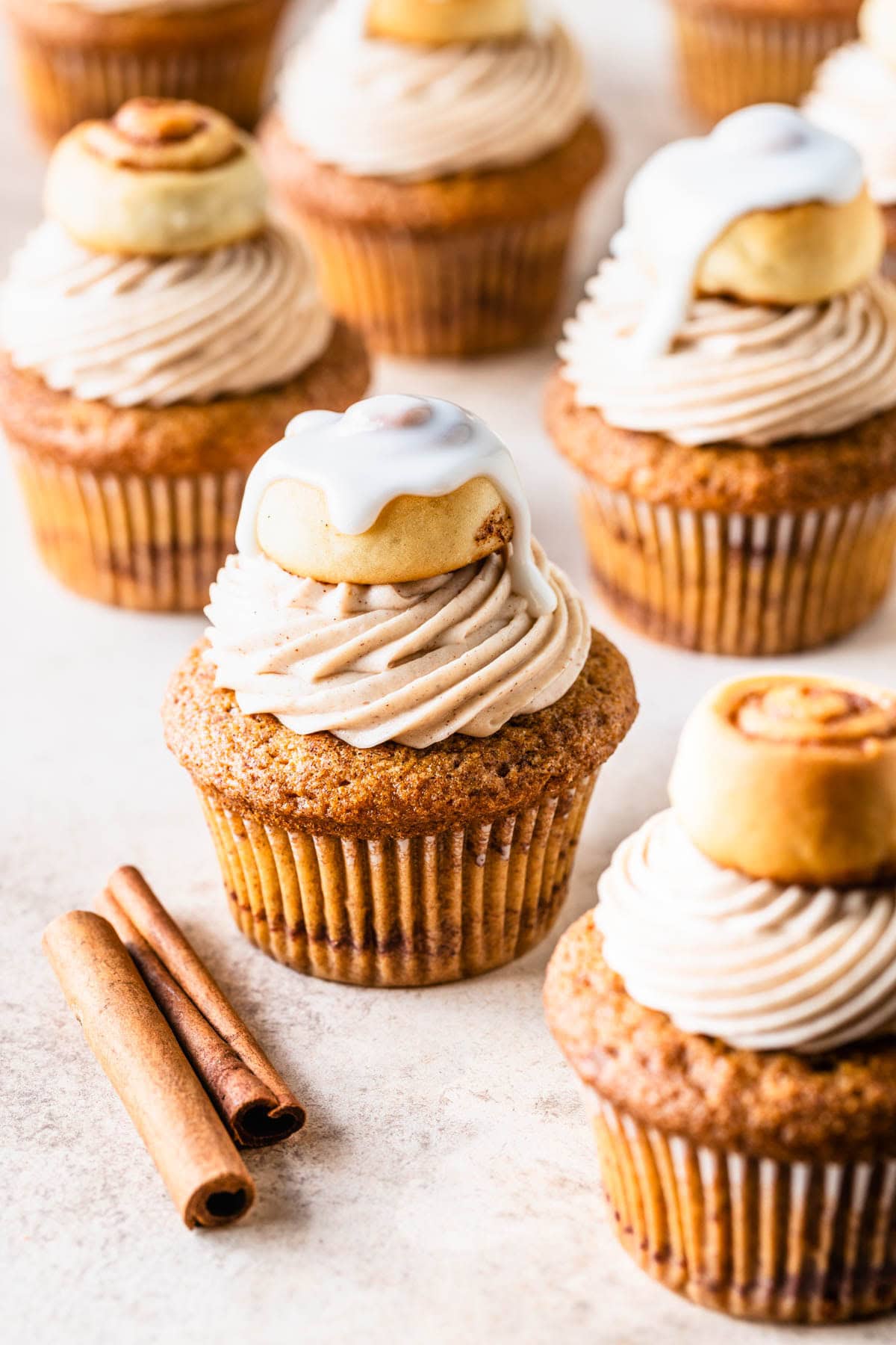 - Frost each cupcake with the Cinnamon Cream Cheese Frosting.Then place a cinnamon roll on top, glaze with a bit of the sugar glaze. Let the cupcakes sit in the fridge for a bit before serving, as you want the frosting and the glaze to set.