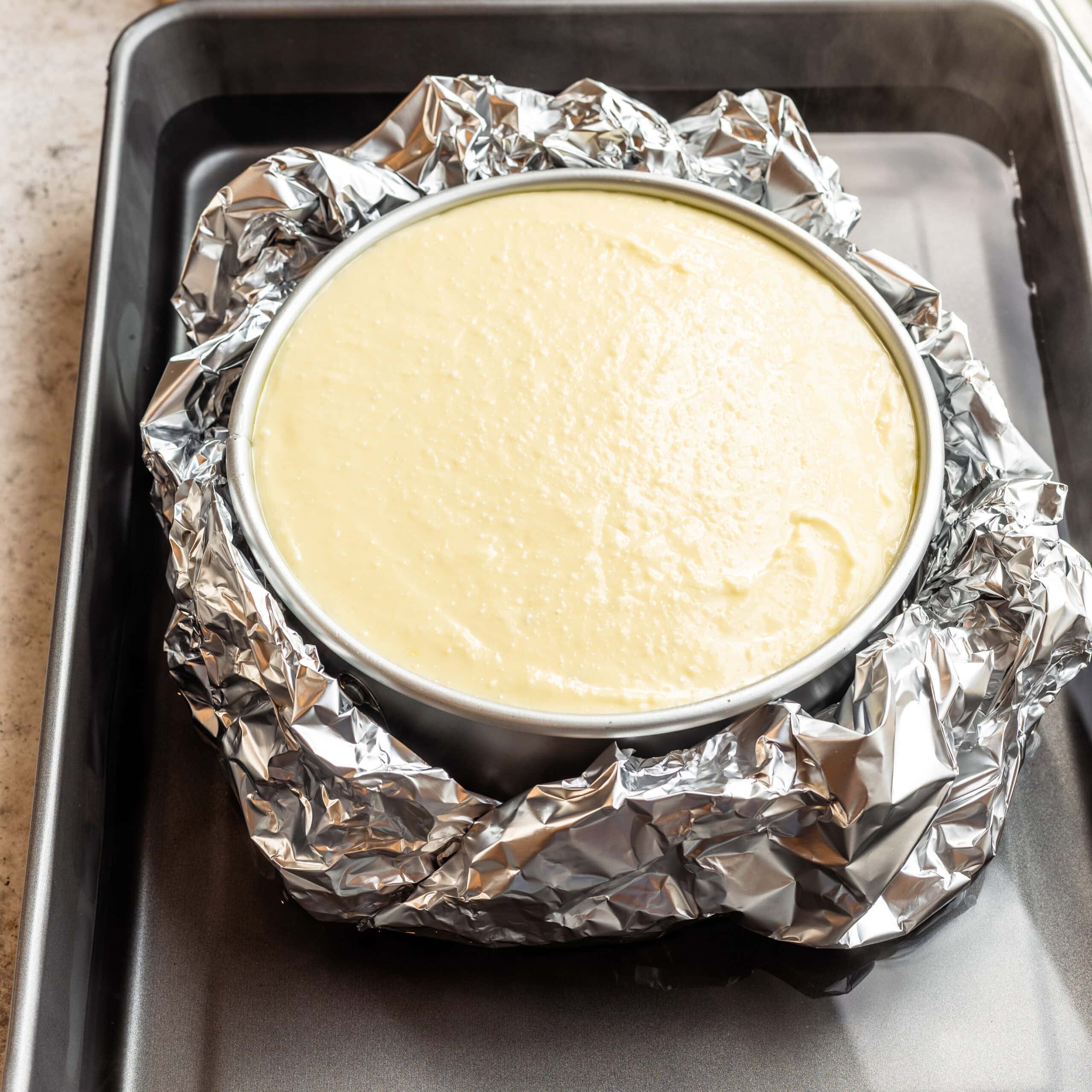- Wrap the bottom of the cheesecake pan with wide foil, especially the base and sides to create a waterproof barrier so water from the water bath canโt leak into the pan while the cheesecake bakes.