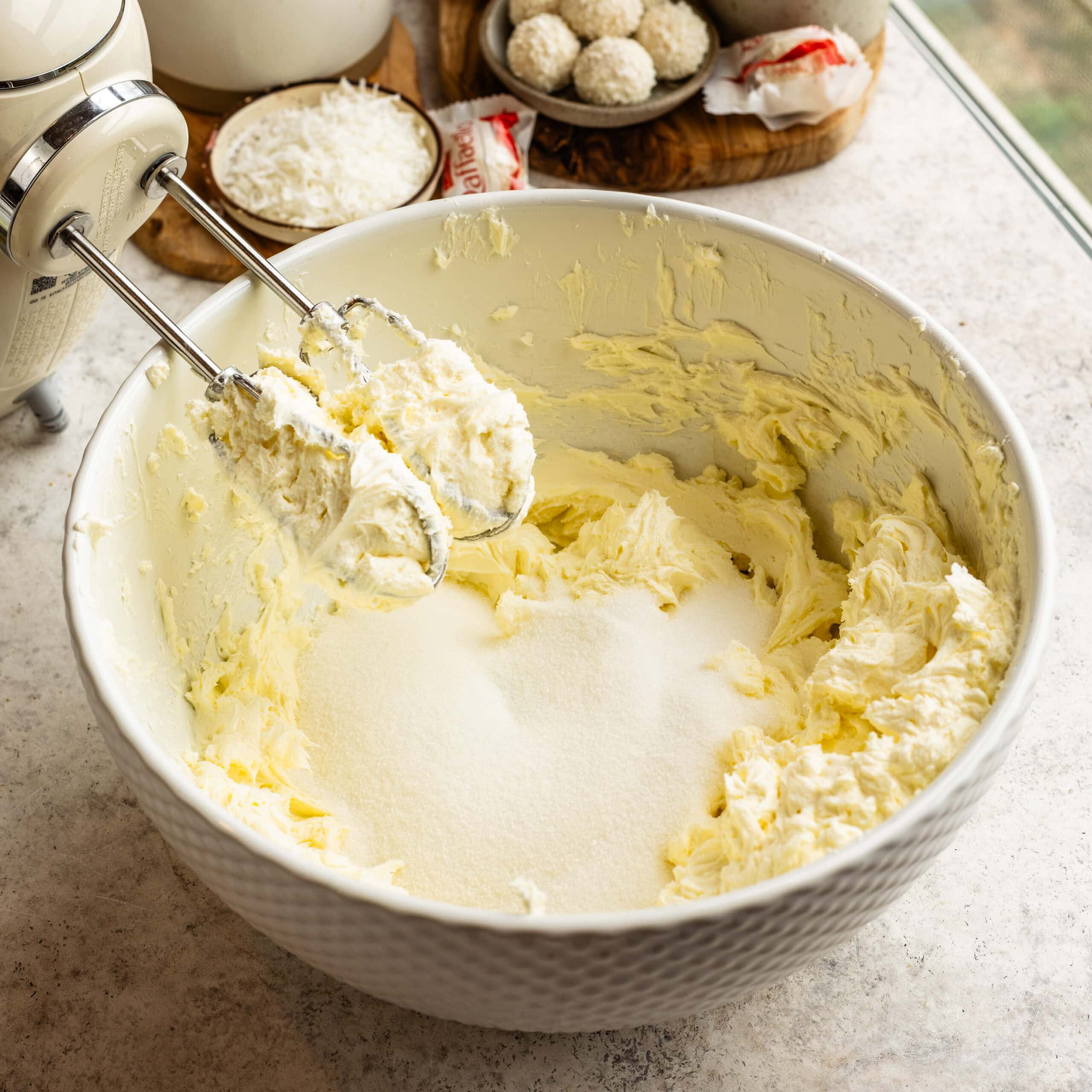 - Add the sour cream and the coconut cream, and mix to combine making sure to scrape the bowl a few times during the mixing process.