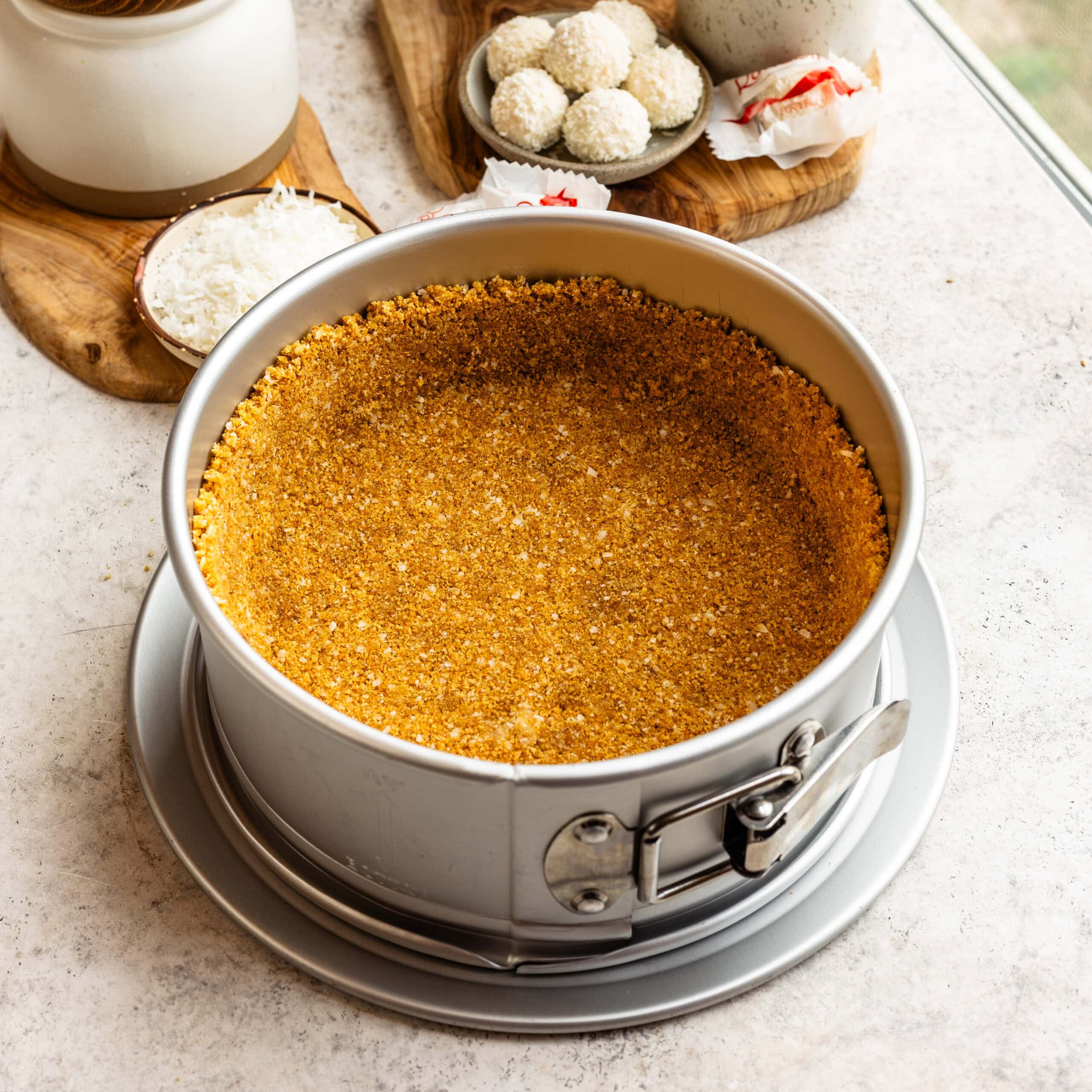 - Bake the crust in the oven for 10 to 12 minutes. Remove it from the oven and let it cool completely before filling with cheesecake batter.
