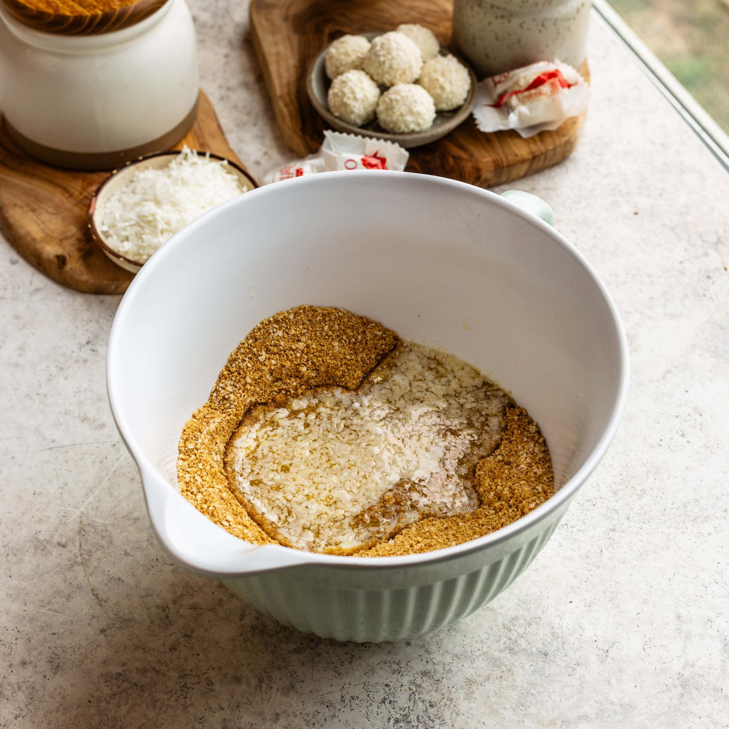 I pulse the graham crackers into fine crumbs, then mix in the shredded coconut and brown sugar. I stir in the melted butter until the mixture looks like wet sand.