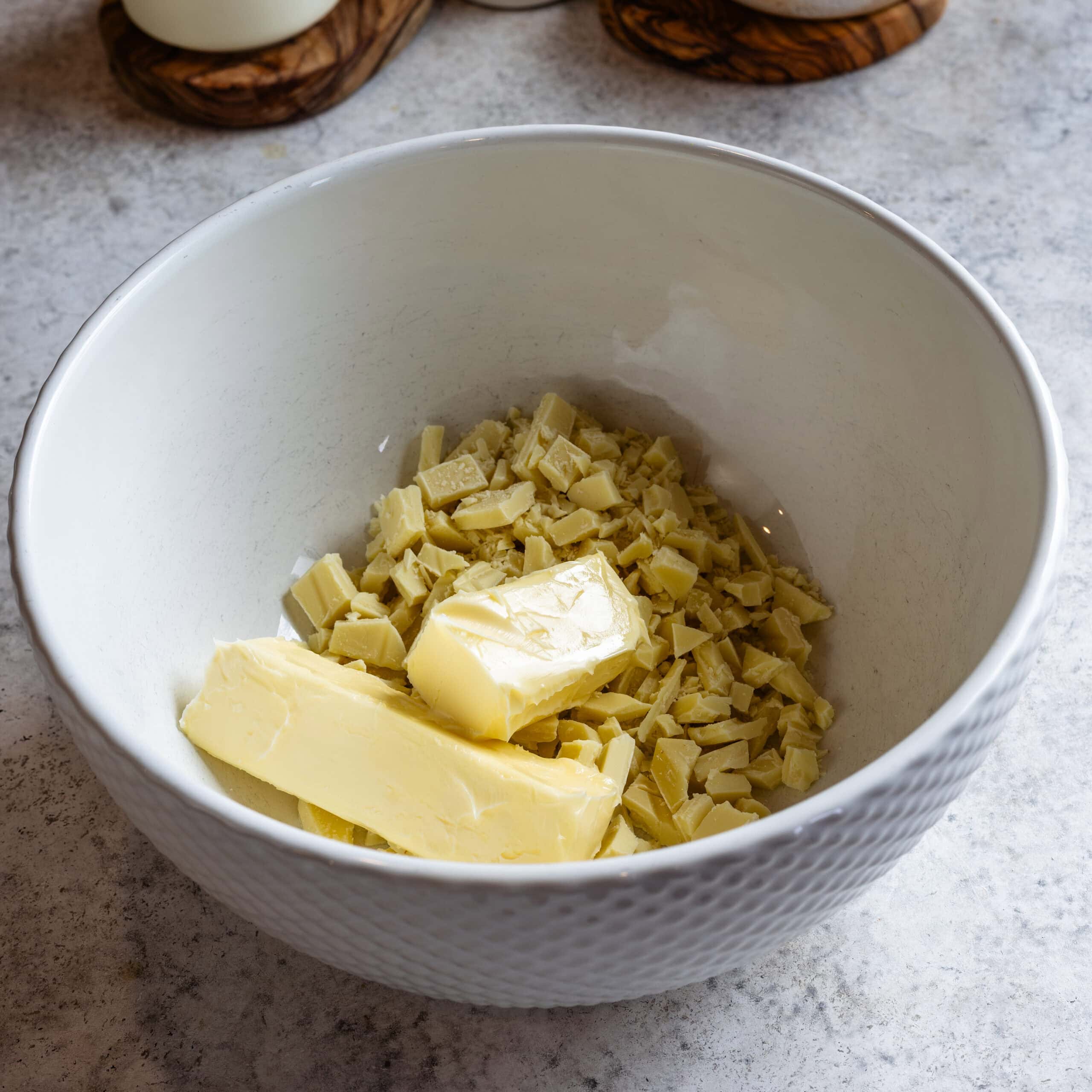 I combine the butter and white chocolate in a bowl and melt them together in the microwave in 15โ€“30 second increments, stirring each time to make sure it doesnโ€™t burn. You can also use a double boiler. I just make sure everything is fully melted and smooth.