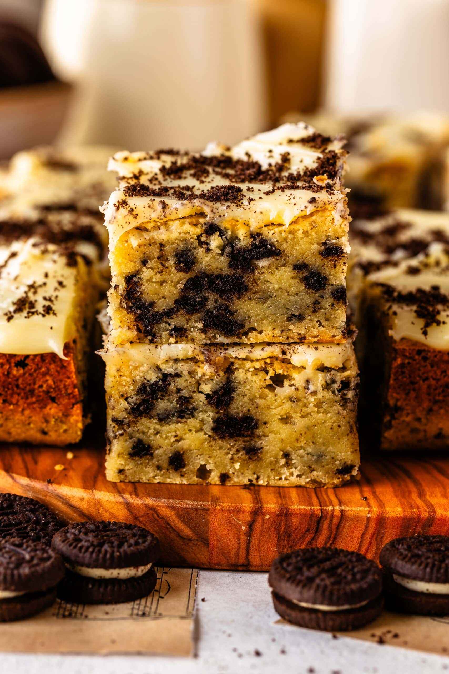 Two stacked cookies and cream blondies with oreo ganache on a wooden serving board.