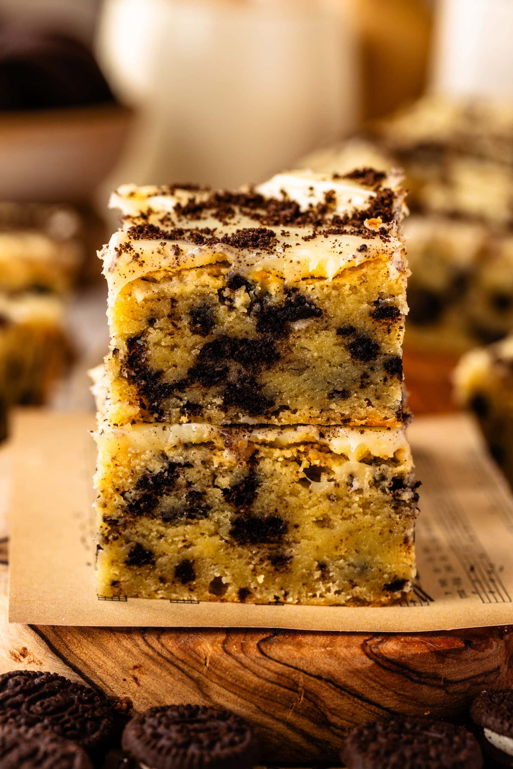 Three stacked Cookies and Cream Blondies with a dense gooey center.