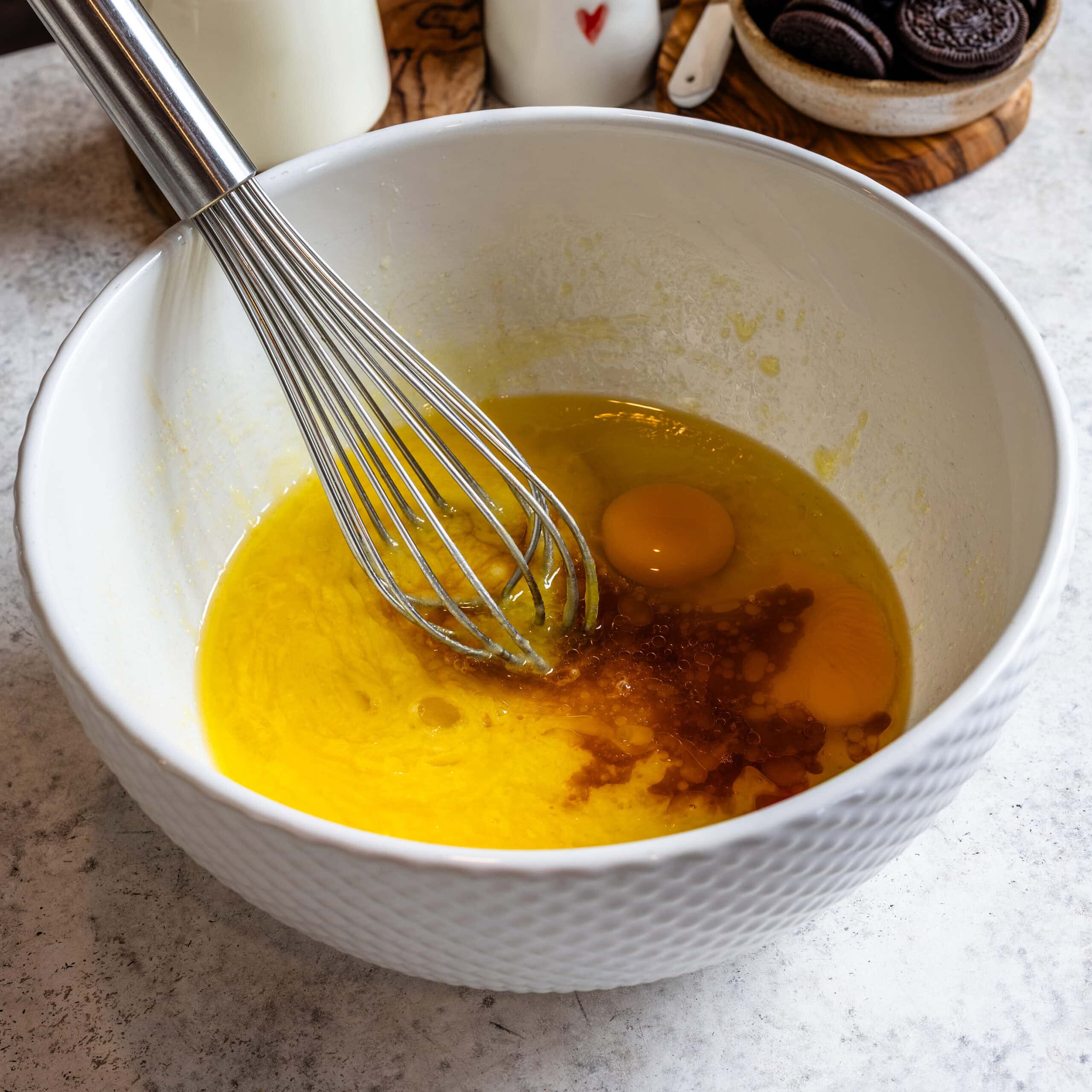 • Whisk. The mixture will seem separated. Thatโ€™s okay. Once you start adding the eggs, it will emulsify and come together.