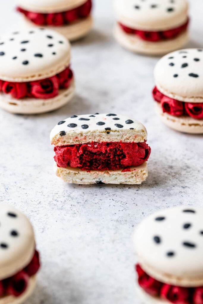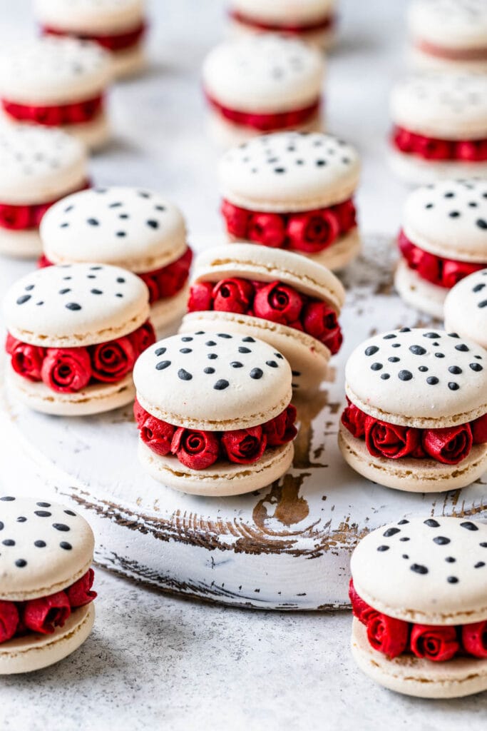 Hello friends! Today we are making these super awesome Cruella De Vil Macarons! They are filled with red velvet cake, and the roses were hand piped with buttercream, and I will show you everything about how to make them!