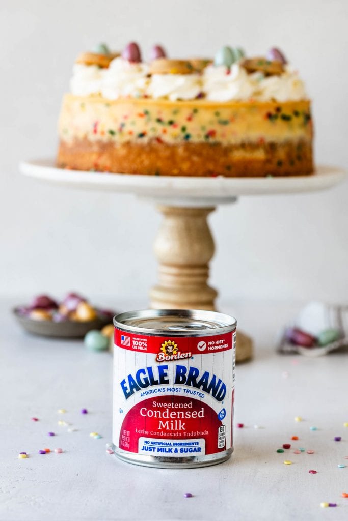 This Funfetti Cheesecake is made with Eagle Brandยฎ Sweetened Condensed Milk, which provides so much richness and a silky texture to the cheesecake.