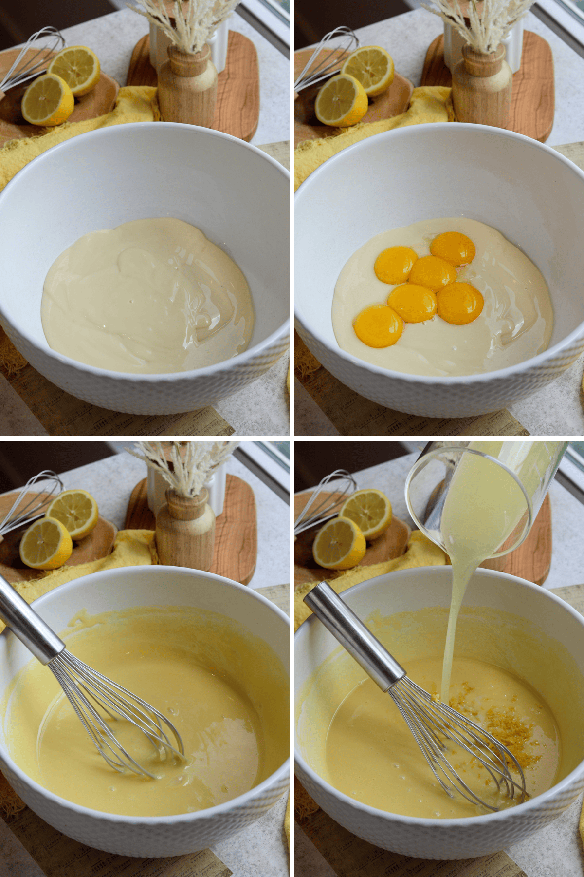 - In a large bowl, whisk together the sweetened condensed milk and egg yolks until smooth. Add the lemon juice and zest, and whisk again until fully combined. The mixture will thicken slightly on its own.