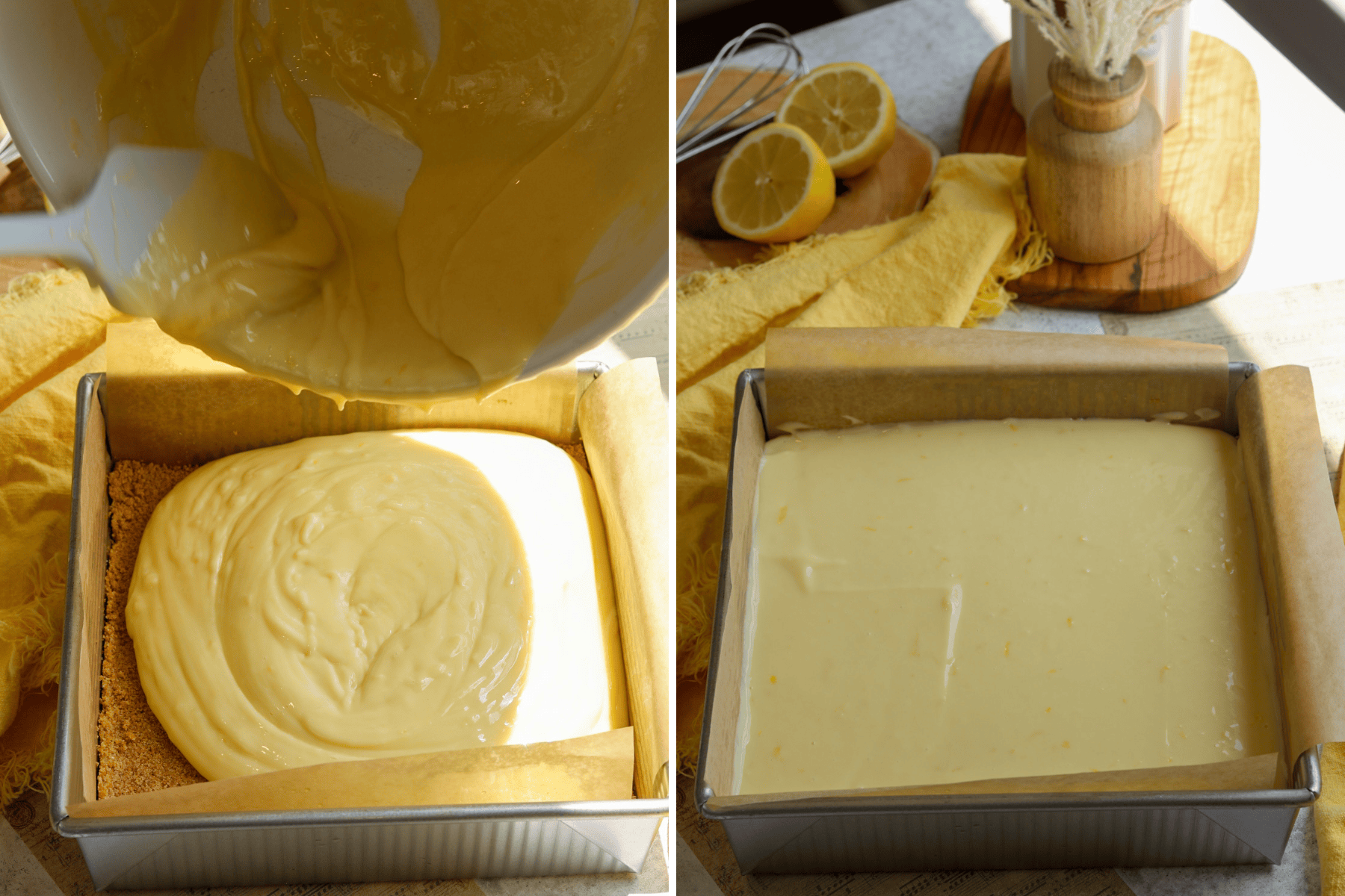 Pour the lemon filling over the warm crust and smooth the top. Bake for 15โ18 minutes, or until the edges are set and the center looks just slightly jiggly. Remove from the oven and allow the lemon curd to cool to room temperature, then transfer to the fridge to chill for at least 4 hours, or preferably overnight.
