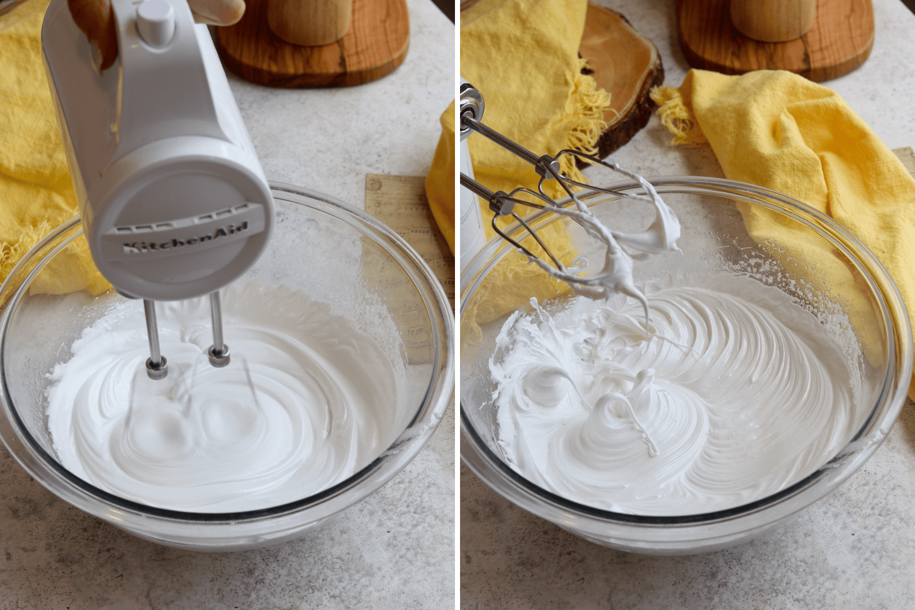 Remove the bowl from the heat and whip the mixture using a hand mixer or stand mixer fitted with the whisk attachment. Beat on medium-high speed for 10โ15 minutes, until stiff, glossy peaks form. The meringue should be thick, shiny, and hold its shape well.