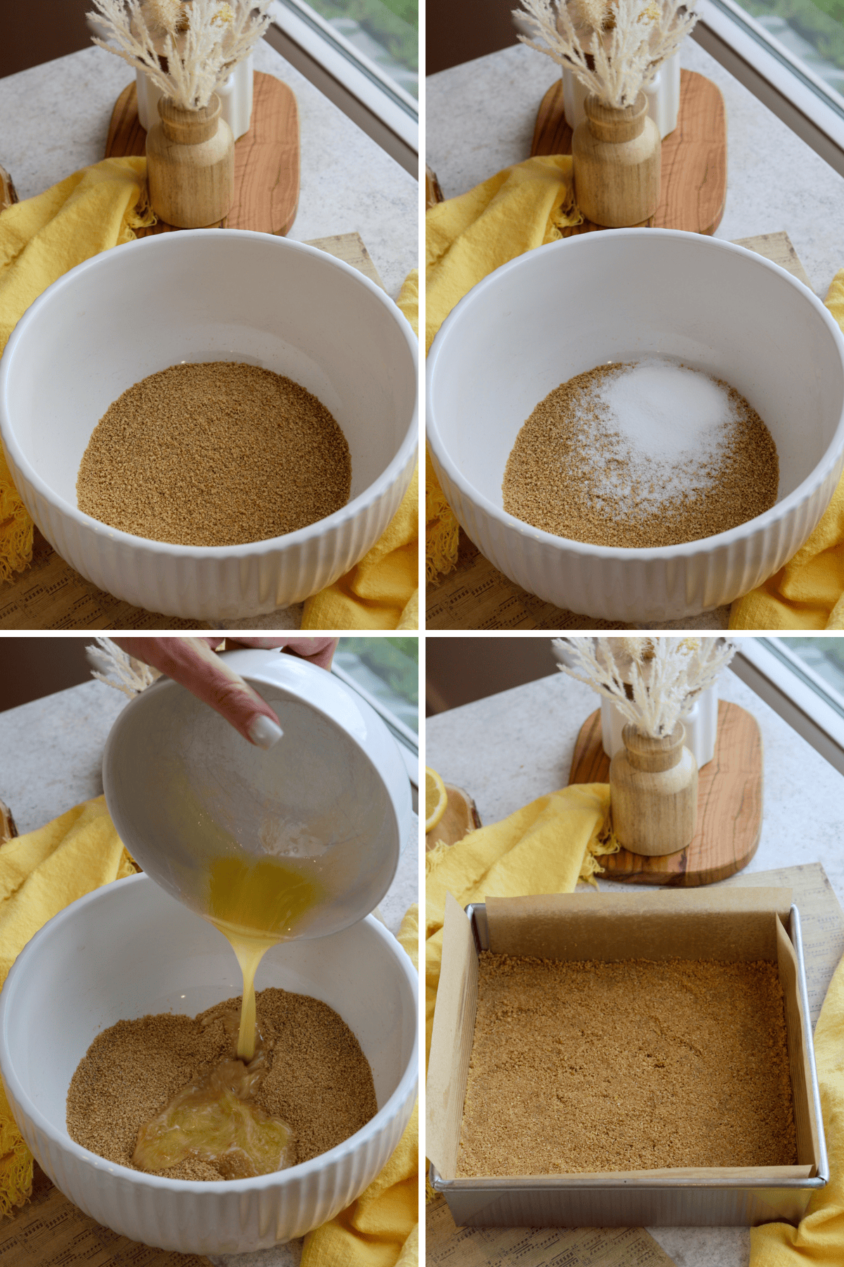 Start by preheating your oven to 350ยฐF and lining an 8ร8 or 9ร9-inch square pan with parchment paper, leaving a bit of overhang for easy removal. If using a tart pan or a pie plate, you can skip the parchment. In a food processor, combine graham cracker crumbs, sugar, and melted butter. Pulse until the texture resembles wet sand, then press firmly into the bottom of your prepared pan or tart shell.