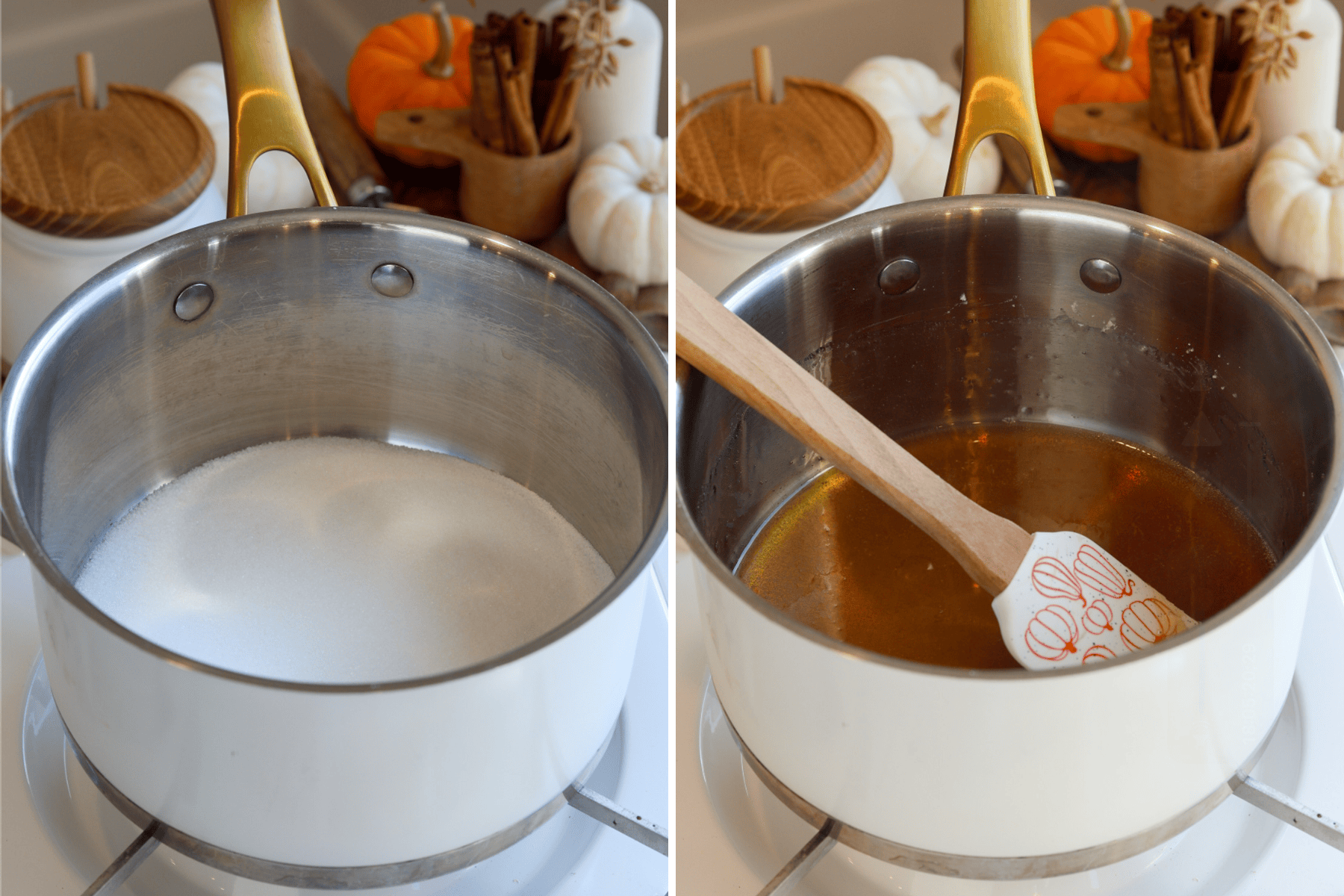 - In a medium saucepan, heat the sugar over medium heat, stirring constantly with a heatproof spatula. The sugar will clump, then melt into a deep amber-colored liquid. Stirring is important to make sure the sugar melts evenly.