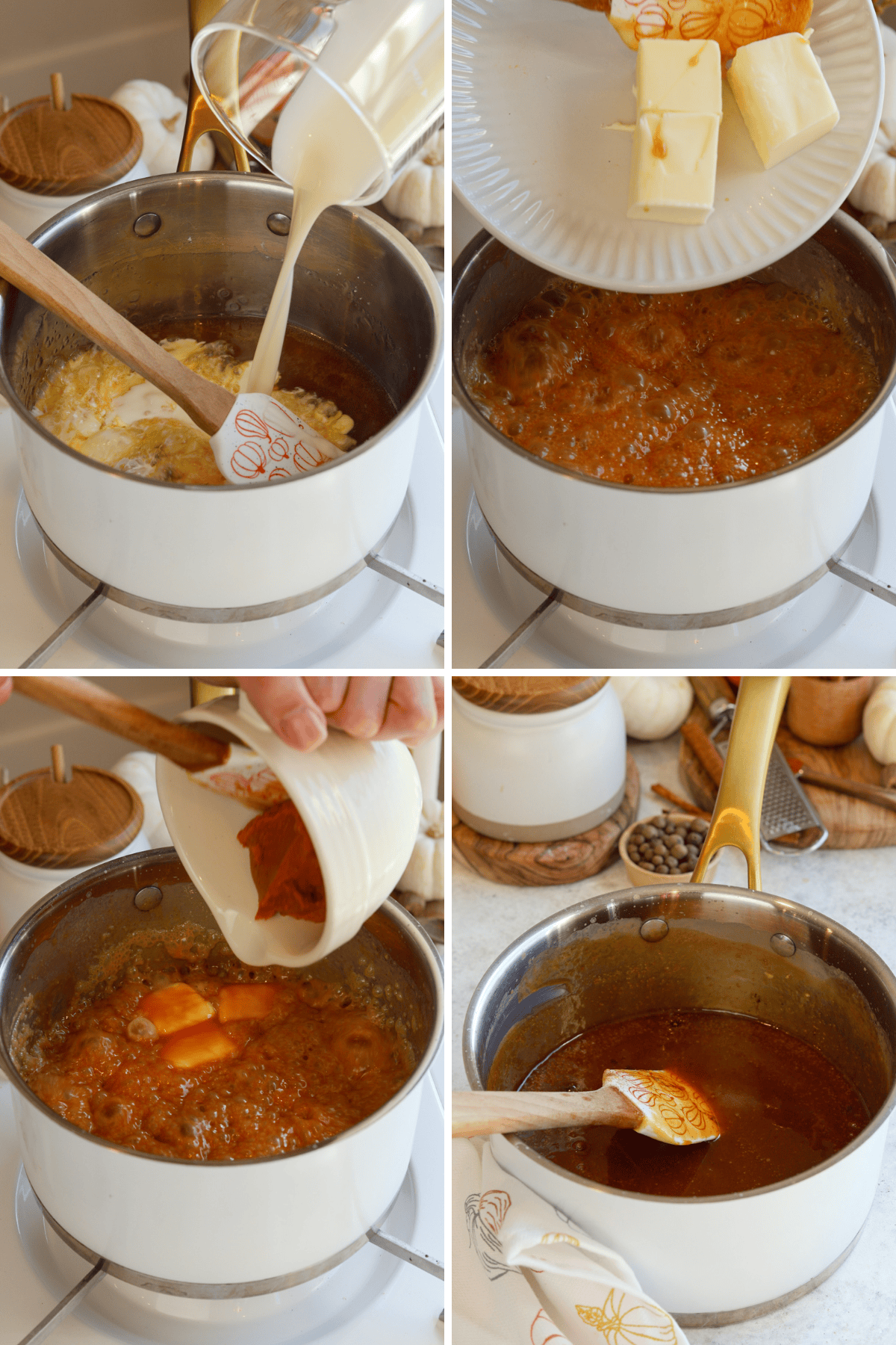 Carefully add the warm cream while stirringโthe mixture will boil and bubble rapidly. Add the butter (cut into pieces) and continue stirring until it melts completely. Whisk in the pumpkin puree, then add the pumpkin pie spice, vanilla, and a pinch of sea salt if you like a sweet-salty finish. Stir until the caramel becomes smooth and glossy.