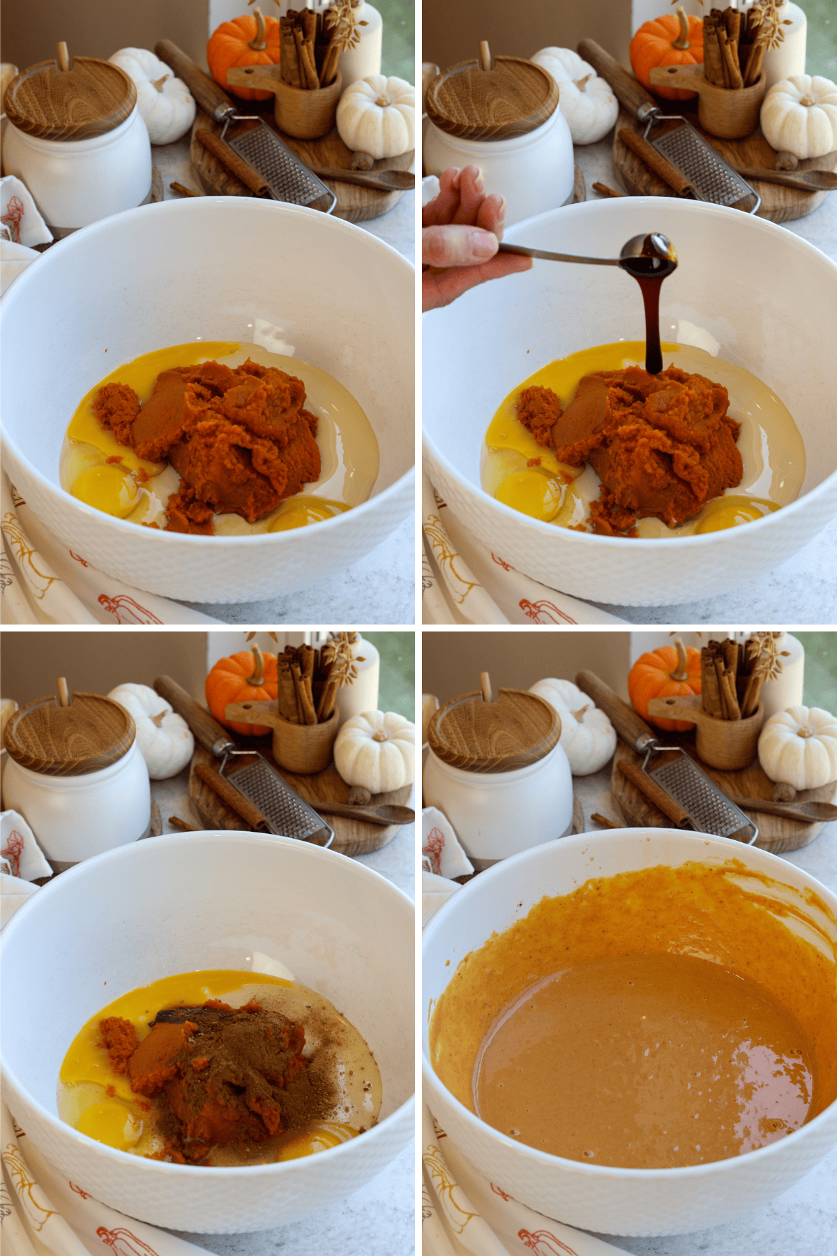 - In a large bowl, whisk together pumpkin purรฉe, sweetened condensed milk, eggs, molasses, salt, and vanilla until smooth and fully combined.