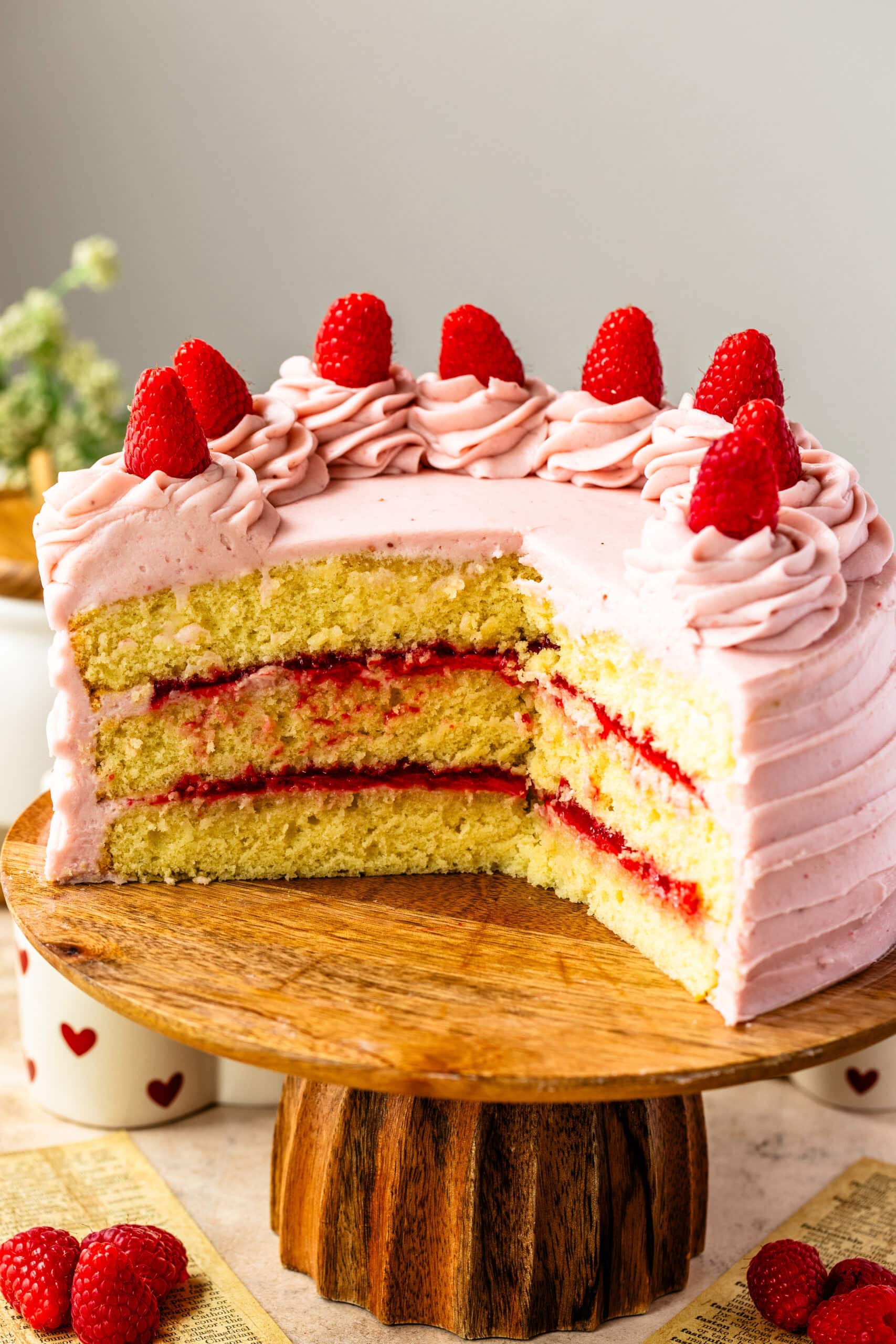 Raspberry cake will always be one of my favoritesโespecially when itโs made with moist, fluffy vanilla cake layers, a tangy cream cheese frosting flavored with real raspberries, and a rich, homemade raspberry jam between each layer.