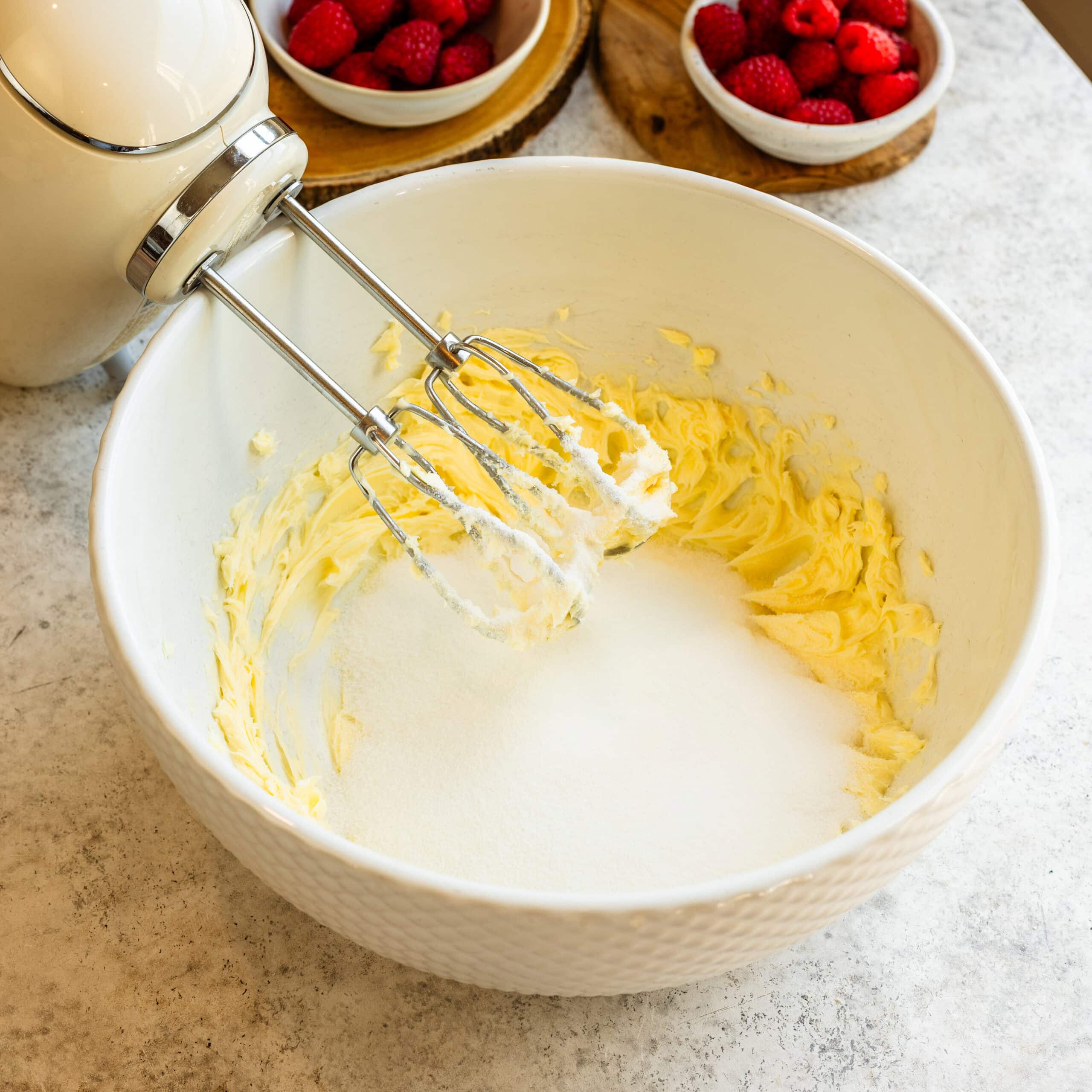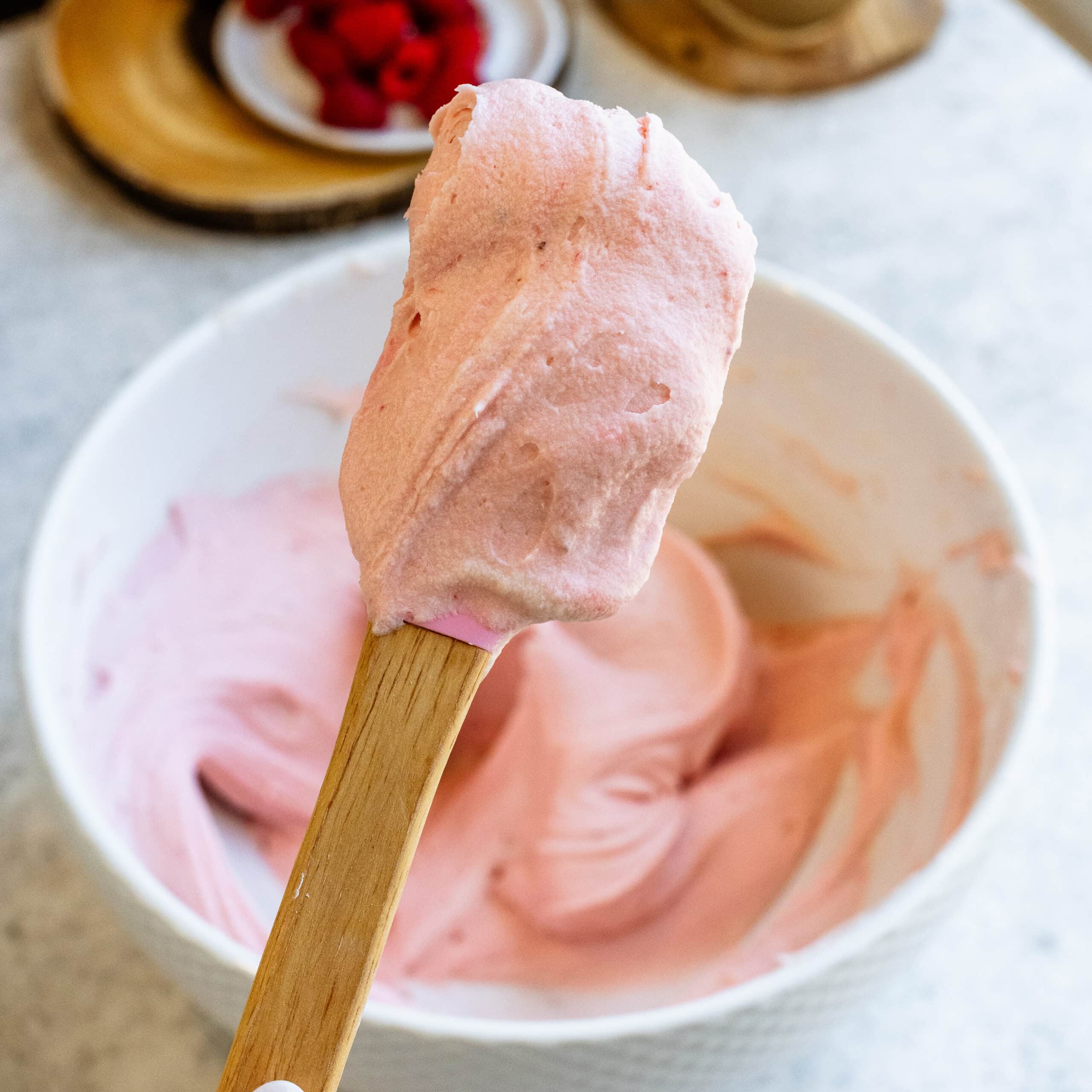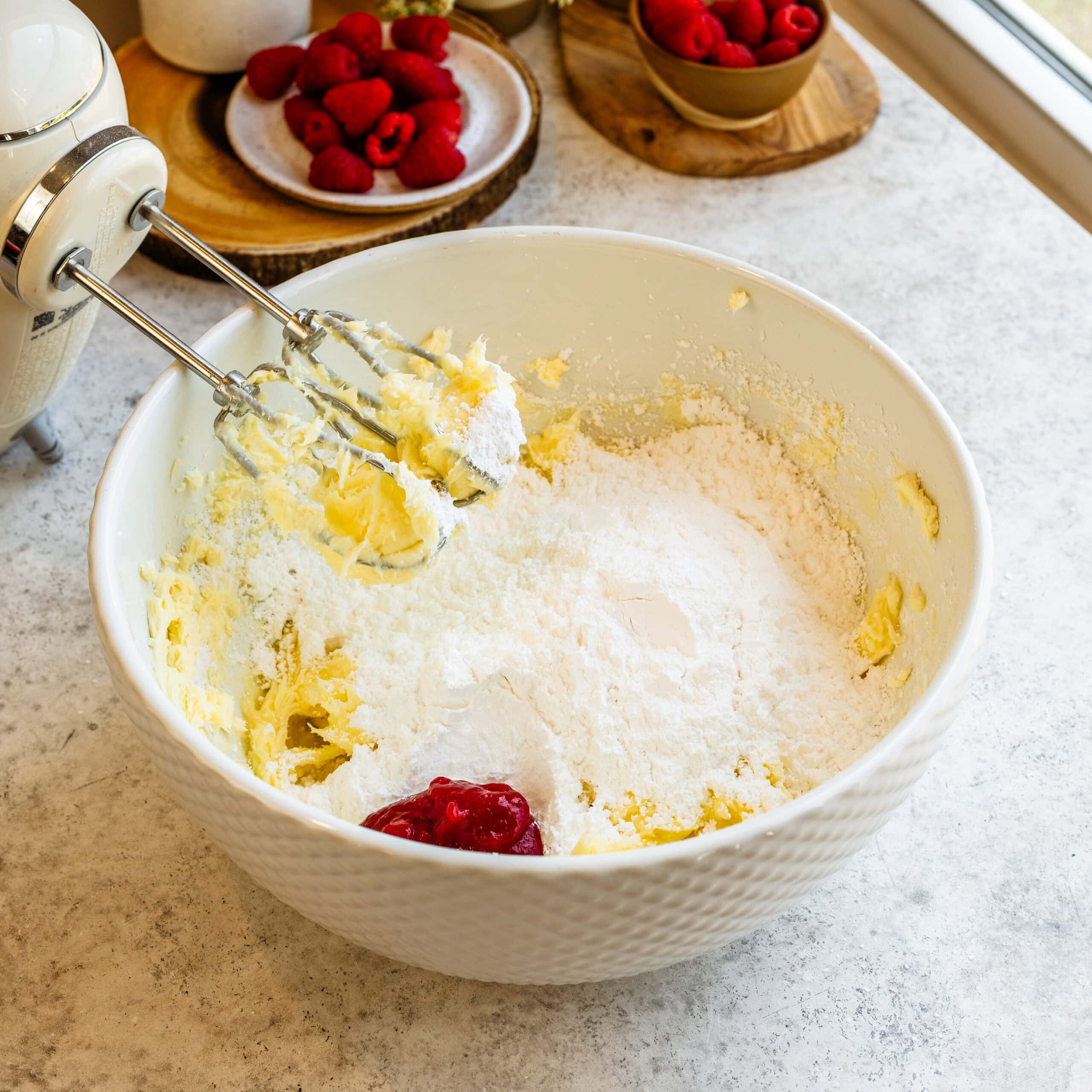 - Beat the room-temperature butter and cream cheese together until smooth, creamy, and completely combined, scraping down the sides of the bowl as needed so there are no lumps. Add half of the powdered sugar, mix on low until combined. Add the raspberry jam and mix until evenly incorporated and the color is uniform.