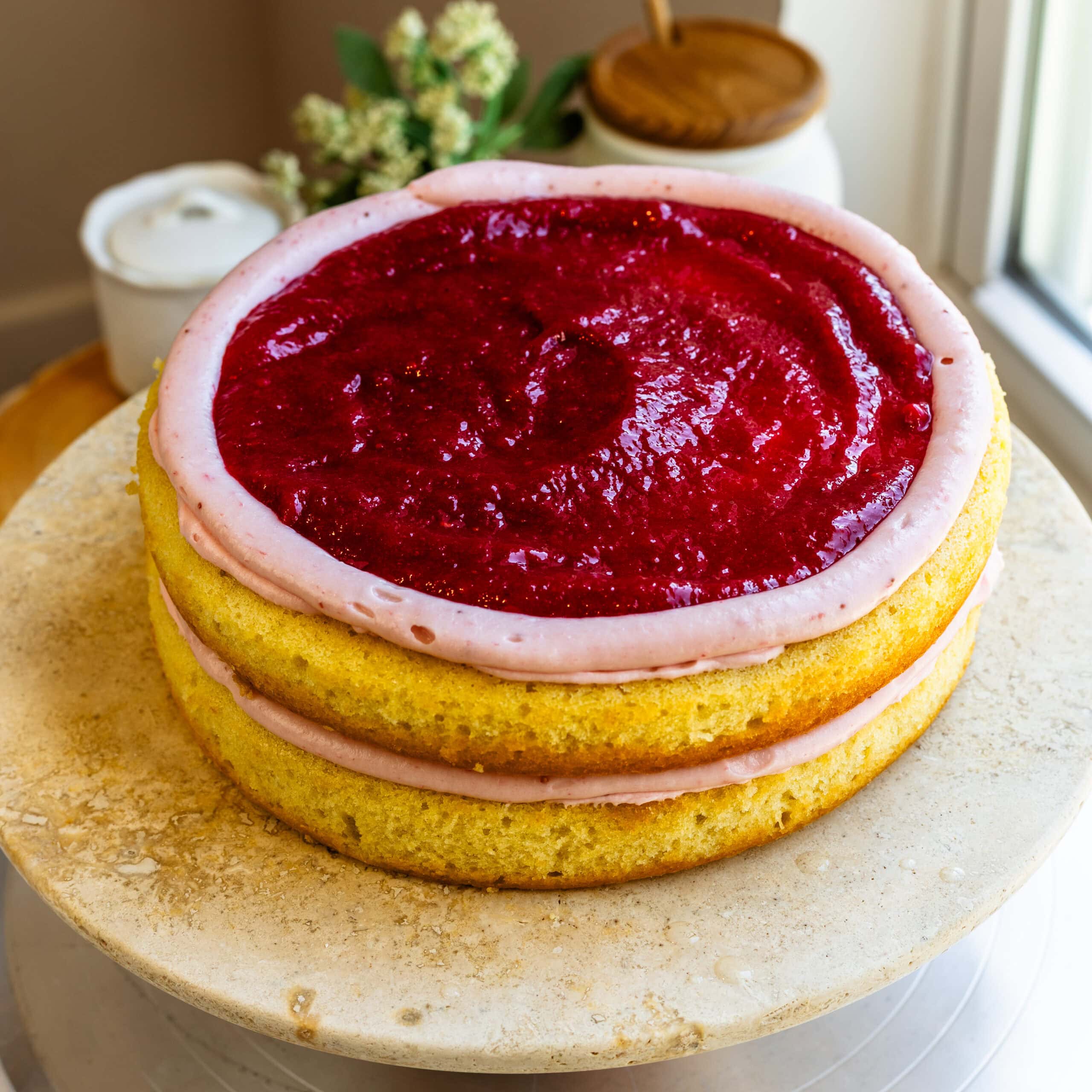 - Place the second cake layer on top and repeat the process: brush with sugar syrup, spread the frosting on top, pipe a frosting border around the edge, and fill the center with raspberry jam. Add the final cake layer, brush it lightly with syrup, and apply a thin coat of frosting all over the cake to create a crumb coat. Chill the cake for about 15โ20 minutes to set the frosting, then finish with a final layer of raspberry frosting, smoothing the sides and top as desired. I like to use a bench scraper to scrape the sides of the cake as I spin the turntable around.