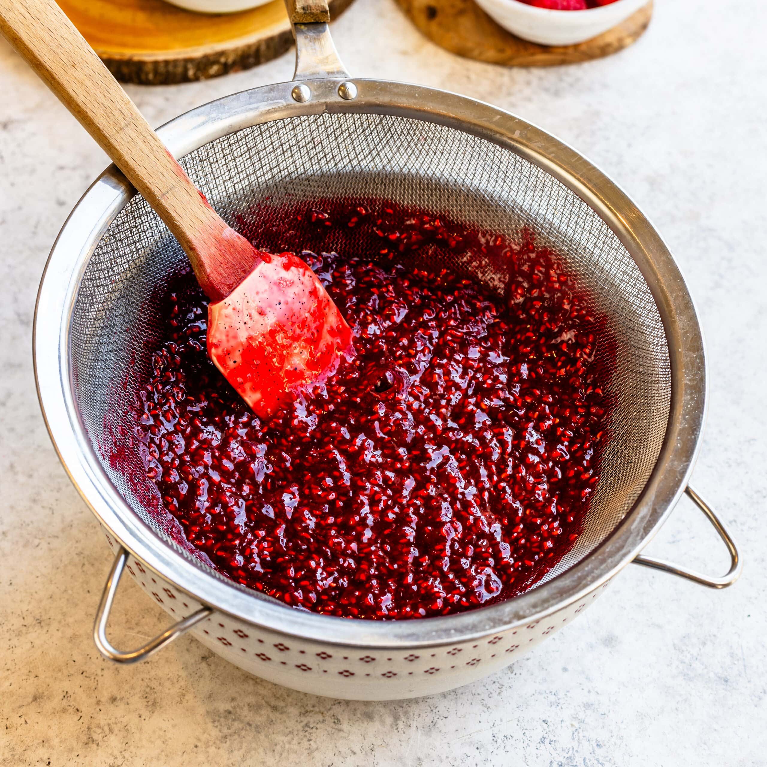 - Remove the pan from the heat and pour the hot jam through a fine-mesh sieve set over a bowl to remove the seeds. Use a spatula to press the jam through the strainer, and be sure to scrape the bottom of the sieve often to collect the thick jam that clings there so you donโt lose any of it. Discard the seeds, then let the strained jam cool before using; it will continue to thicken as it cools.