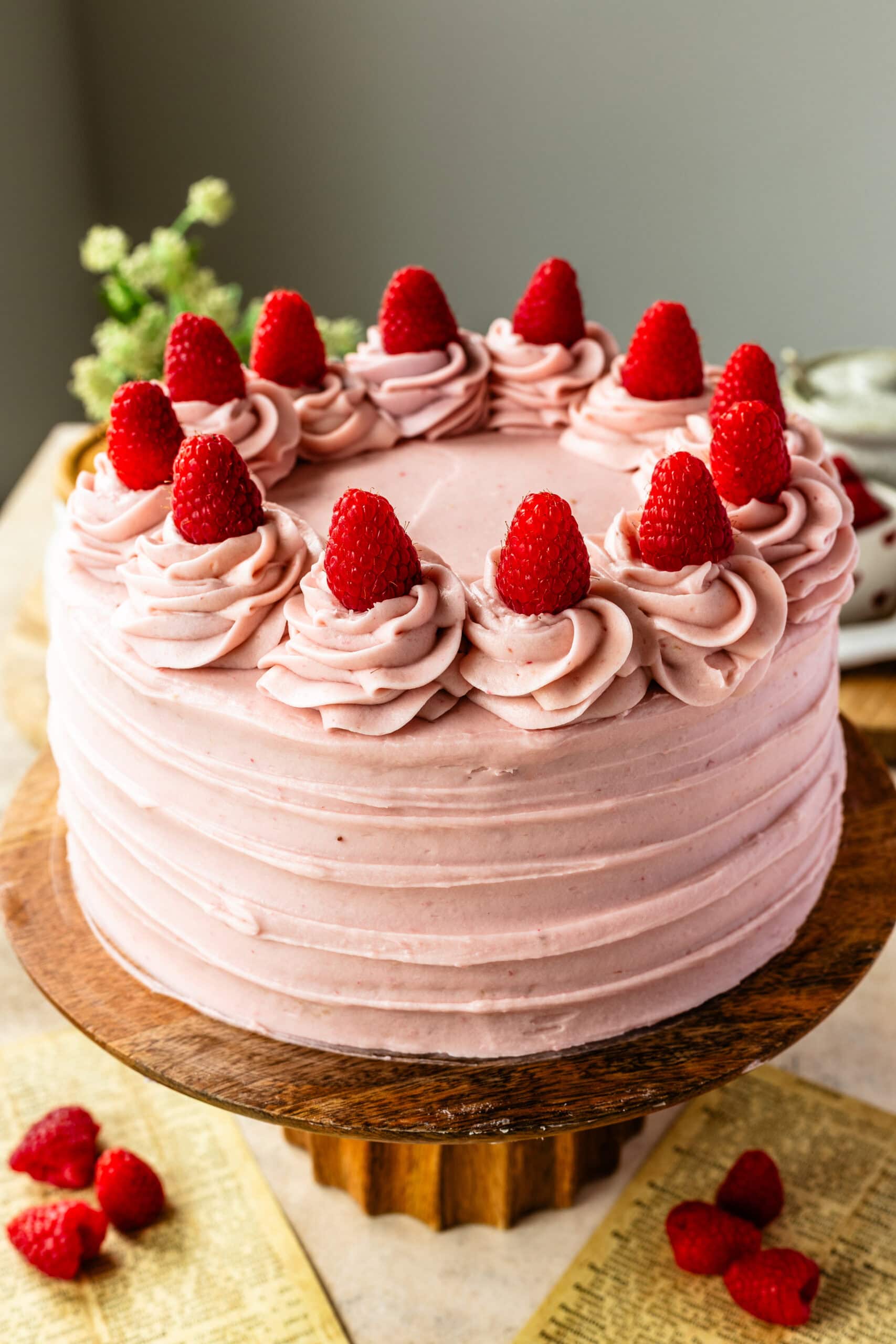 Finish frosting the cake. I use a bench scraper to smooth the sides while rotating the turntable, and I smooth the top with an offset spatula angled slightly inward. Then I like to pipe little swirls and top them with fresh raspberries! So beautiful! Make sure to chill the cake for at least one hour before slicing.