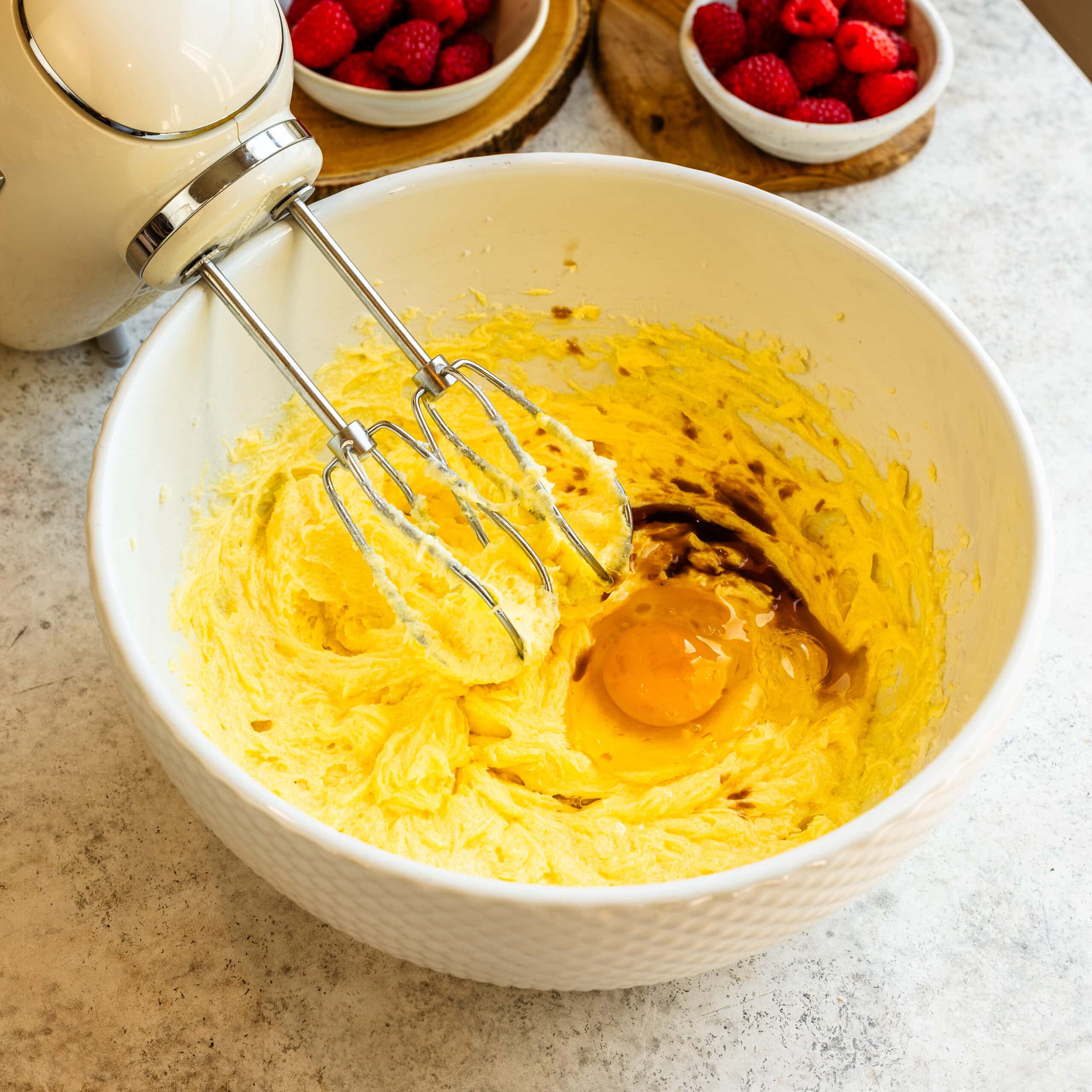- Remember to scrape the bowl in between mixing. Add the vanilla and mix to combine.