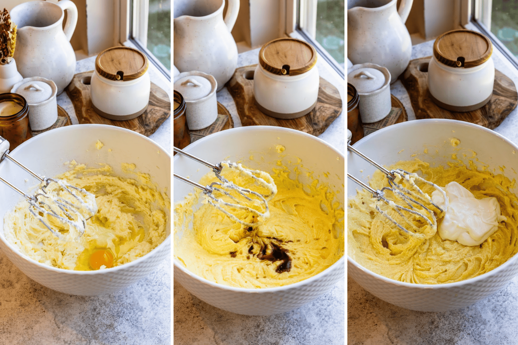 I beat in the eggs one at a time, giving each one a moment to fully incorporate so the batter emulsifies. Once the eggs are in, I mix in the vanilla and almond extract. Then add the sour cream and scrape down the sides of the bowl to make sure everything is evenly combined.
