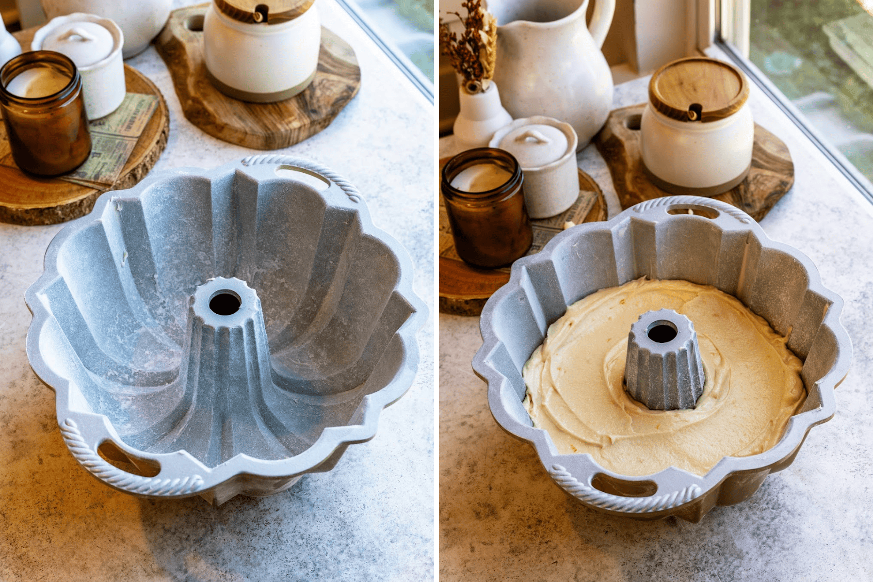 First, I always prepare my baking pan, and in this case weโre using a bundt pan. I make sure to coat EVERY groove in the bundt pan with butter and dusting it with flour so the cake releases easily. Paying extra time here gives you the best shot for having the cake come out perfect.