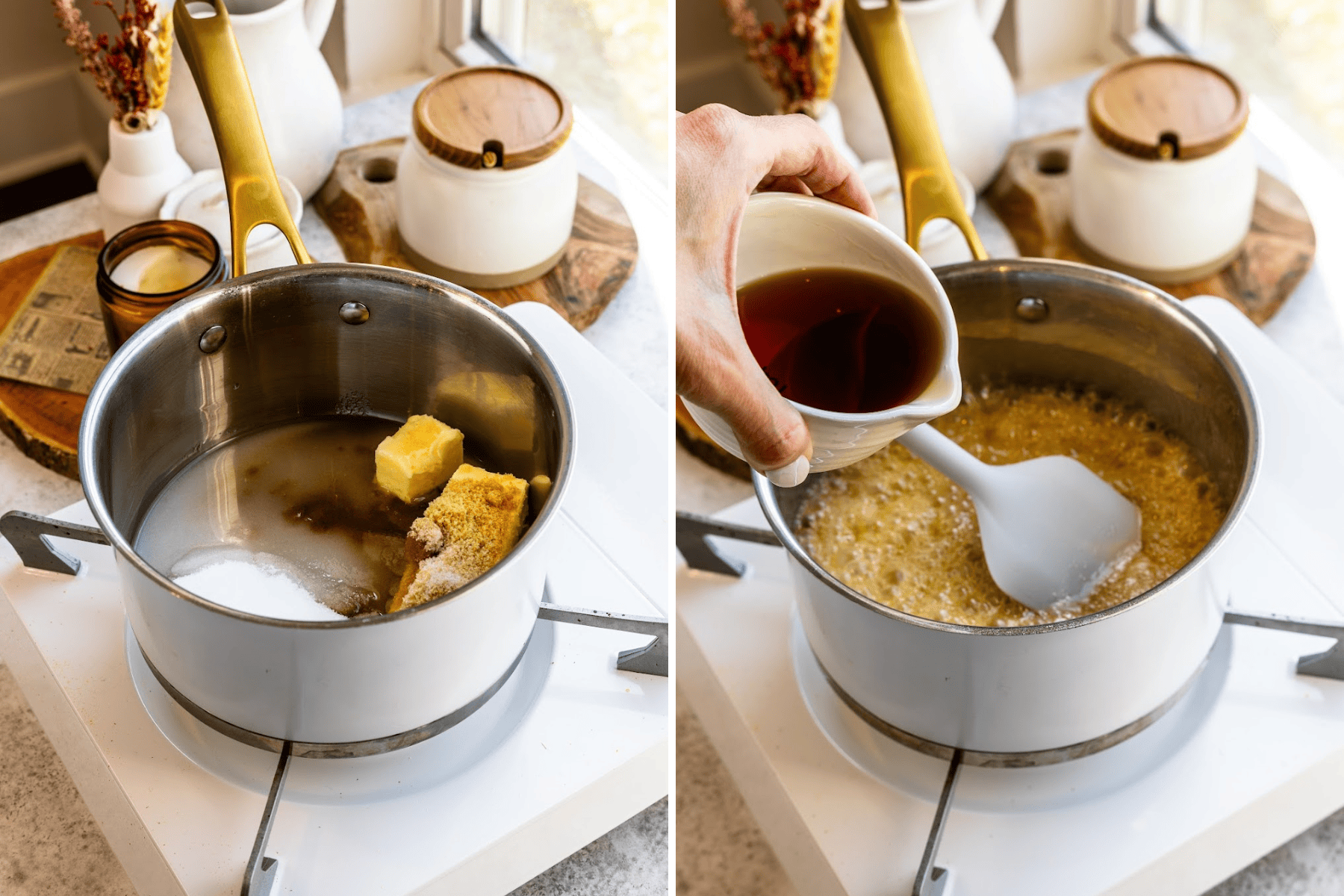 While the cake cools, I make the syrup. In a saucepan, melt the butter with the sugars and water over medium heat. Bring the mixture to a gentle boil and let it bubble for several minutes until the sugars dissolve and it looks glossy. Remove from the heat and stir in the rum, vanilla, and a pinch of salt. The aroma alone will tell you this is going to be good.