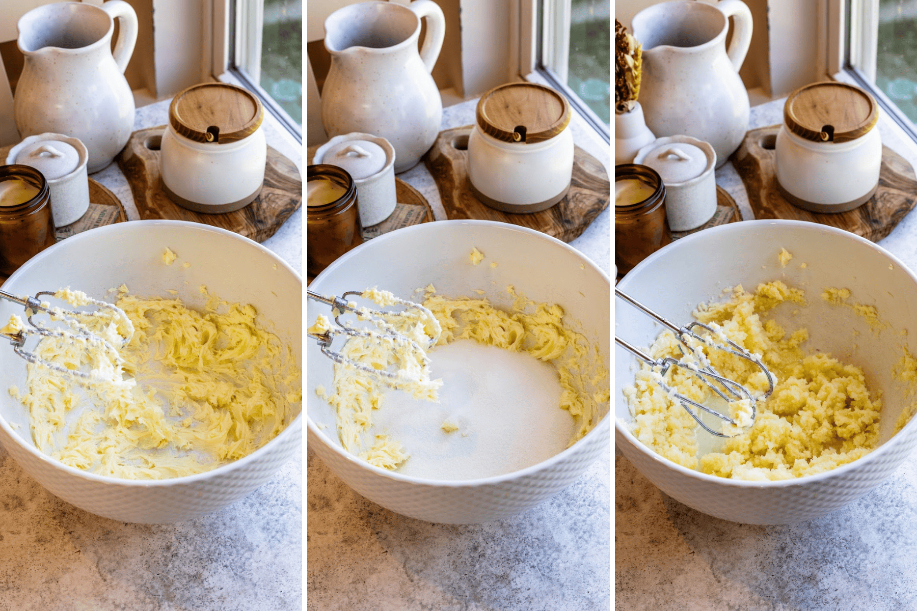 - In a large mixing bowl, or the bowl of a stand-mixer, beat the butter for 1 minute. Add the sugar and beat for another 3 minutes until pale and fluffy.