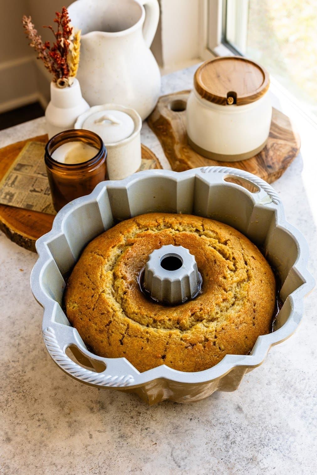 I always nake until a toothpick inserted into the center comes out clean. Bundt cakes often take close to an hour, so be patient. Let the cake cool for about 10โ15 minutes before adding the syrup.