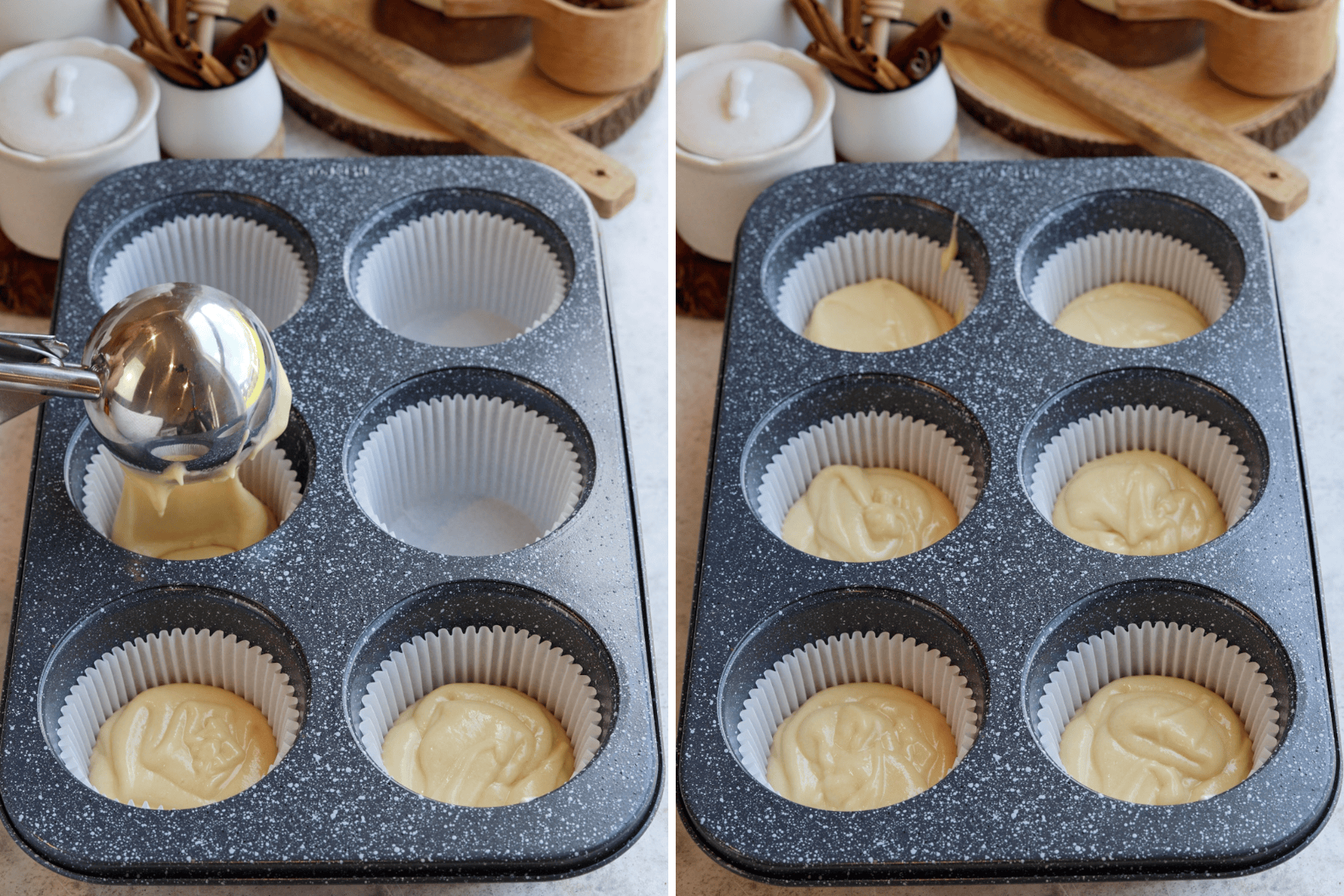 - Divide the batter evenly among the cupcake liners, filling them about two-thirds of the way.