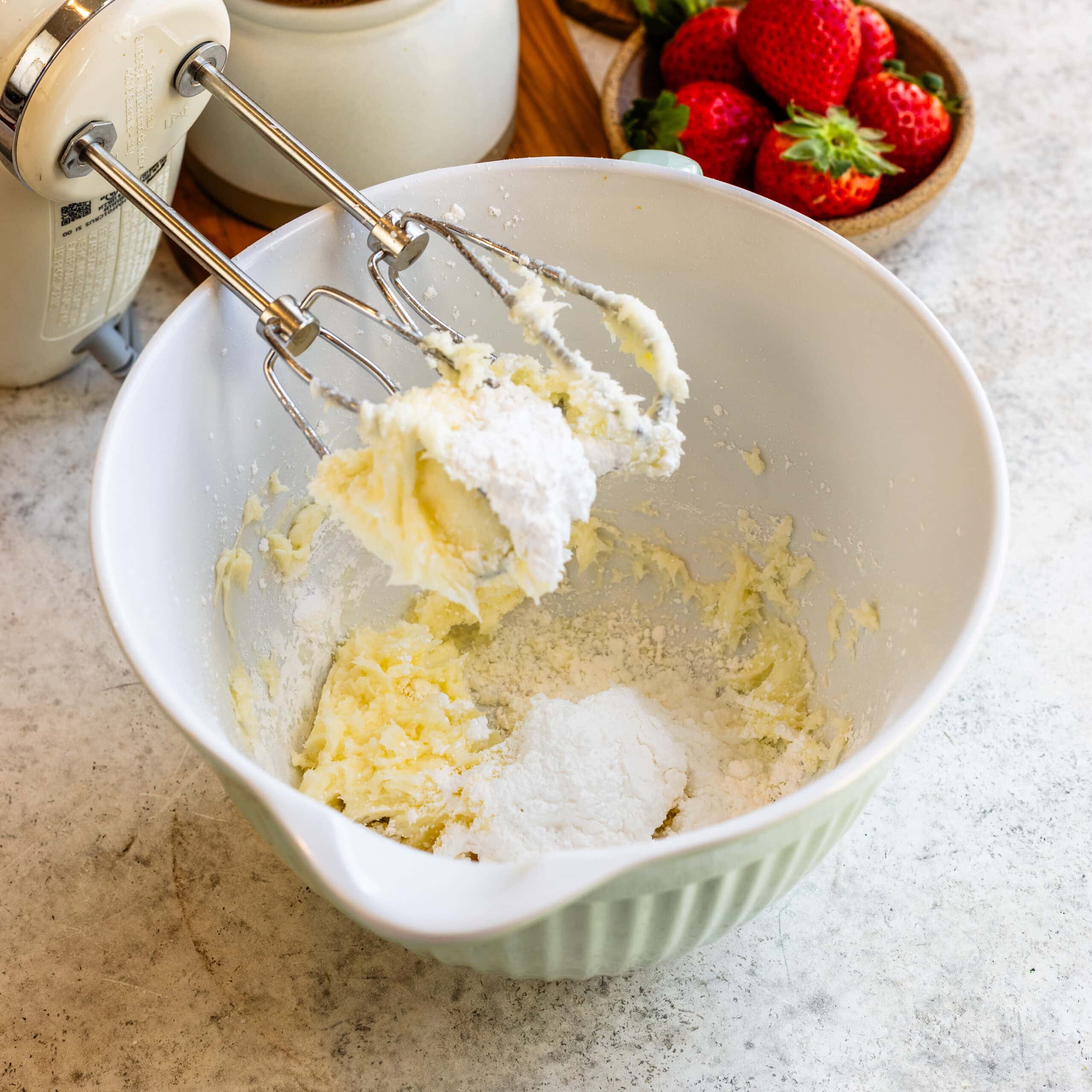 - Add 1 ยฝ cups of powdered sugar and mix on low.