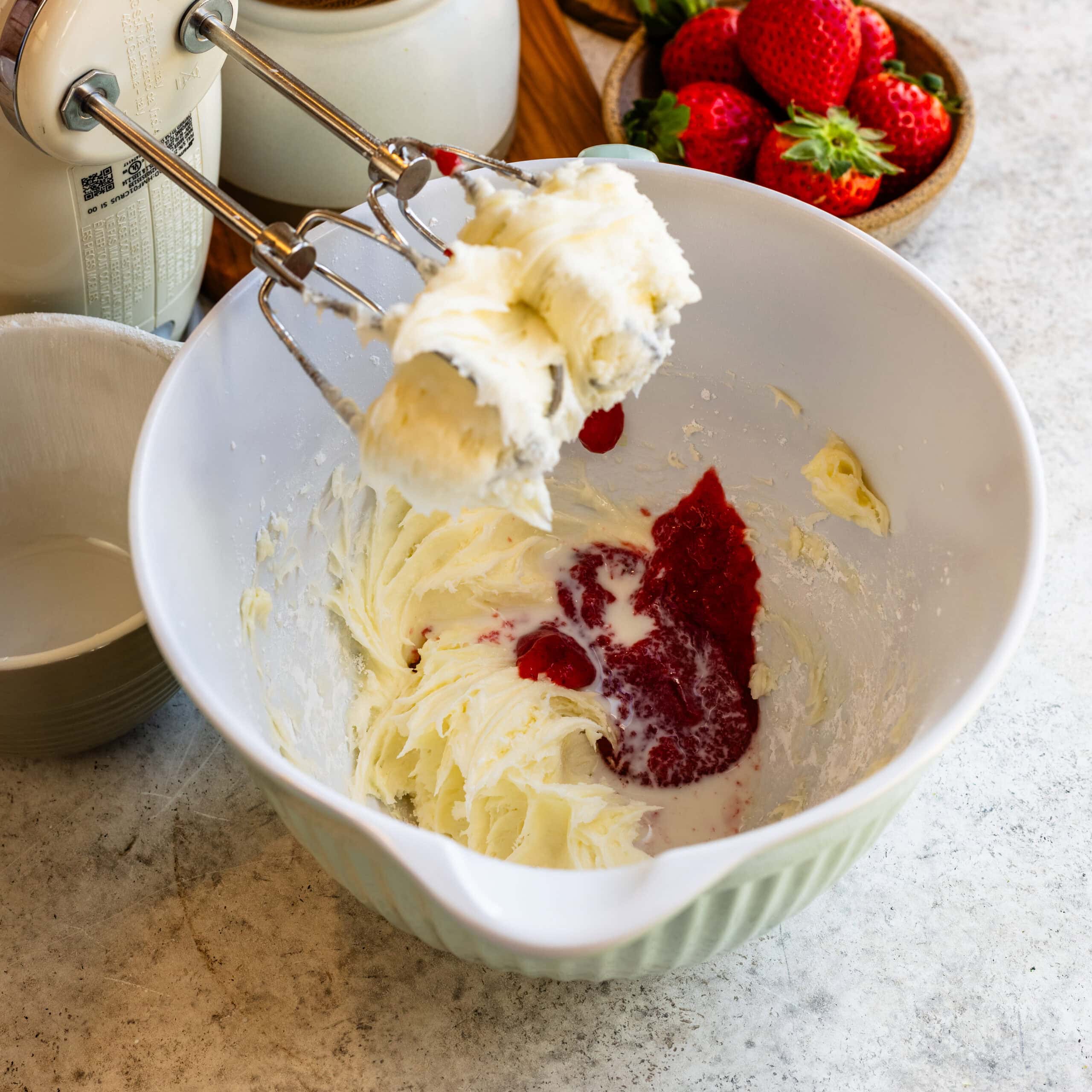 - Pour the sour cream, and ยฝ cup of the strawberry purรฉe in the bowl and mix. You can place the remaining strawberry purรฉe in the fridge, covered, to use in the frosting later.