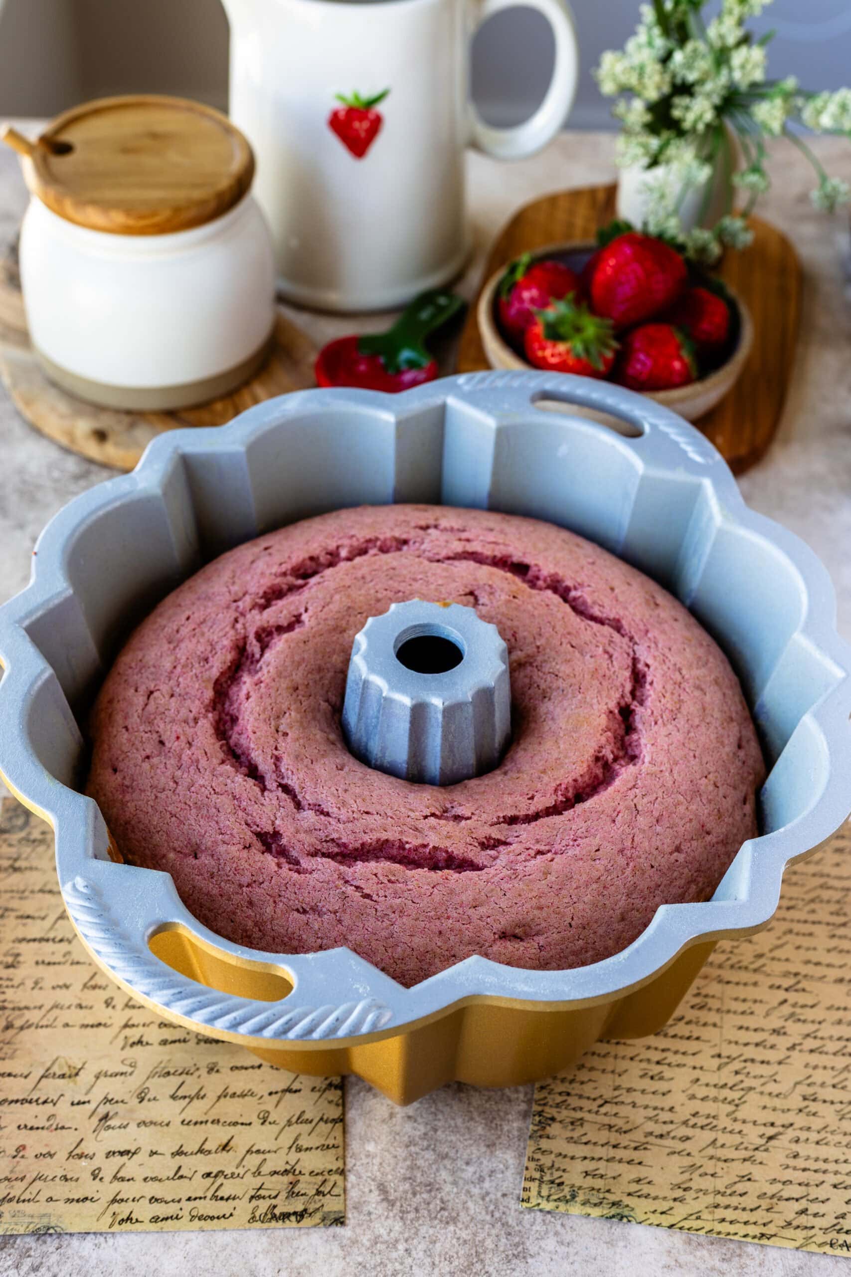 - Bake the strawberry bundt cake in the pre-heated oven for about 45-50 minutes, until a toothpick comes off clean when inserted in the cake.