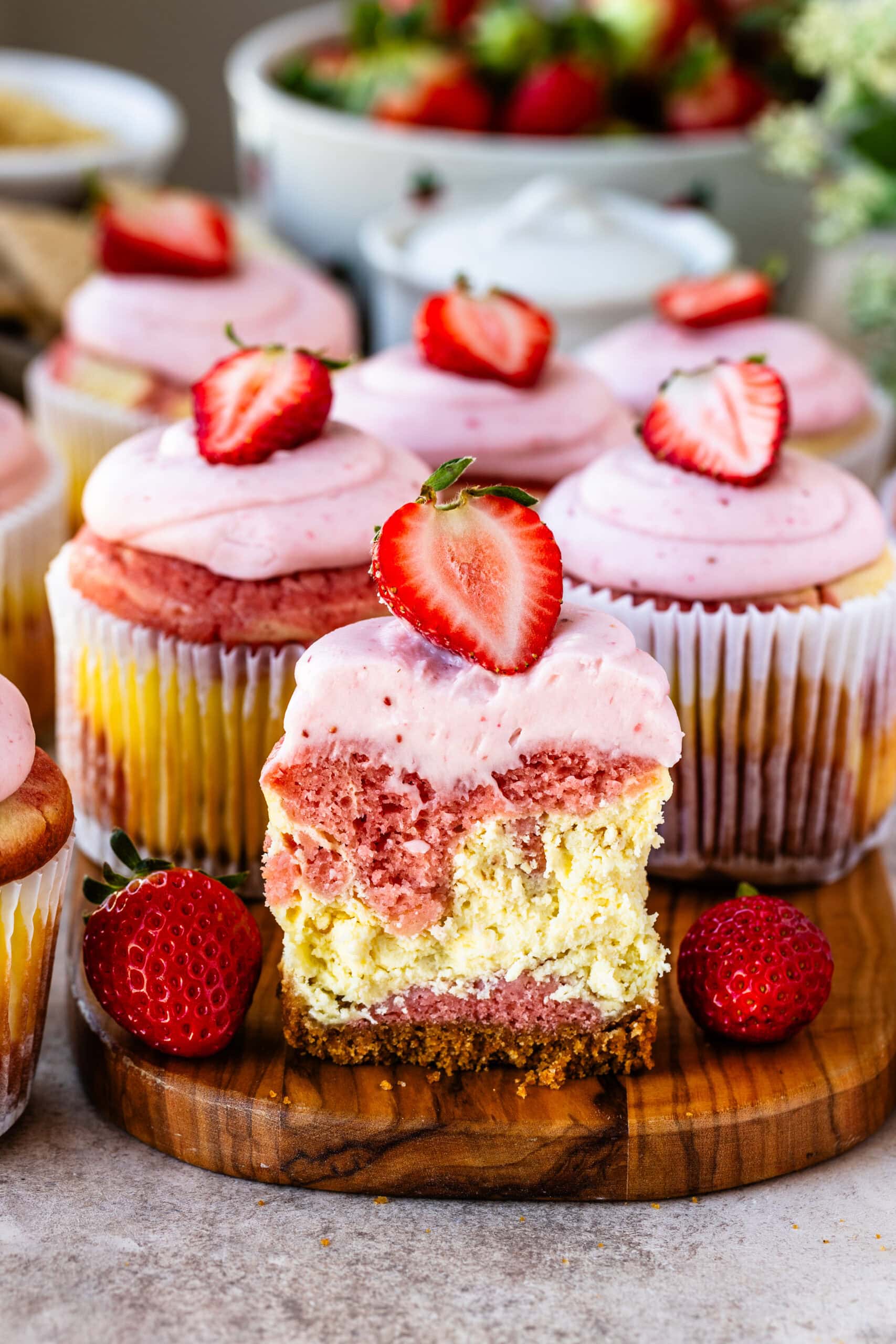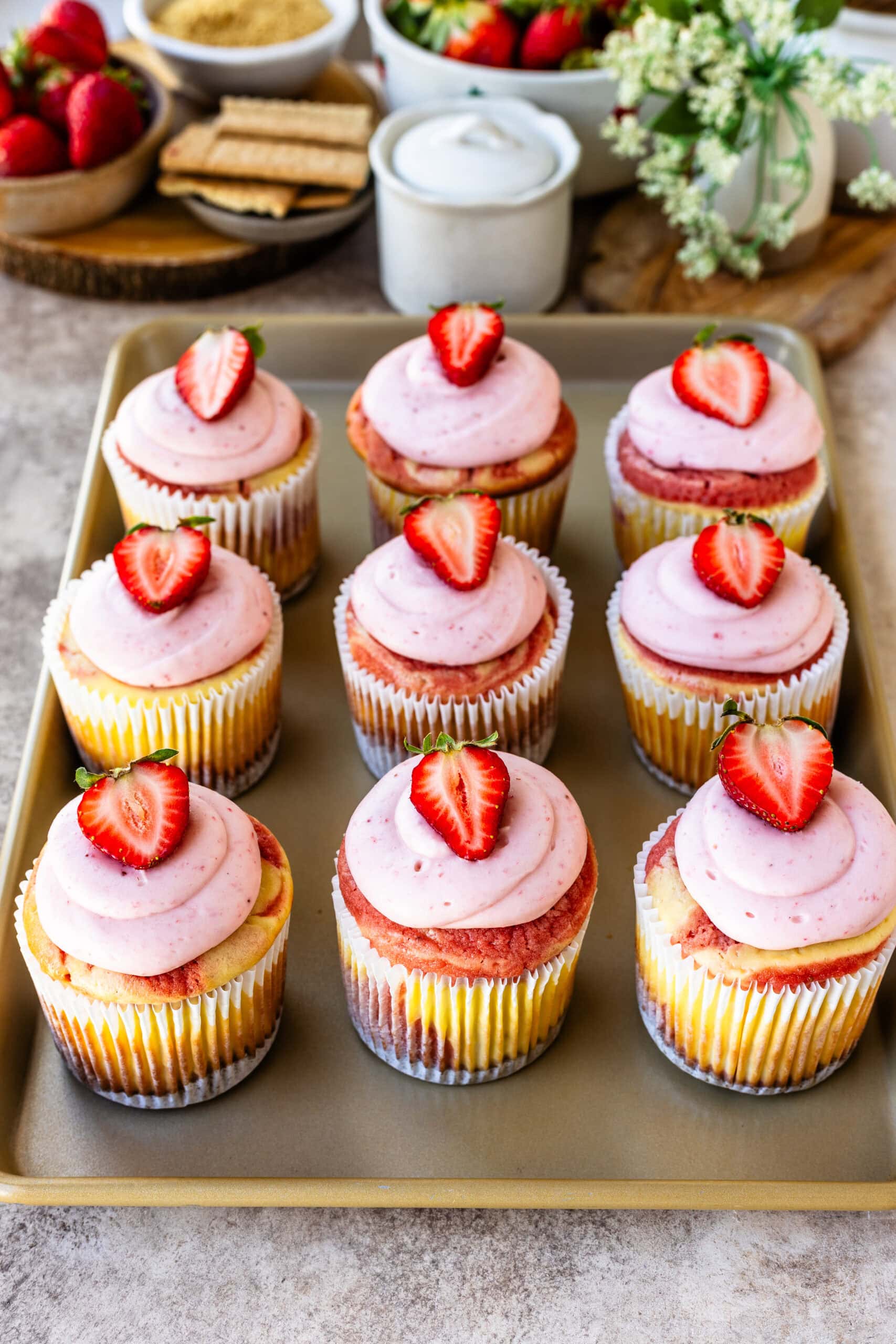 Graham Cracker Crust โ Itโs simple, but it sets the whole tone. Without it, theyโre just strawberry cupcakes with frosting. With it, they become cheesecake cupcakes.