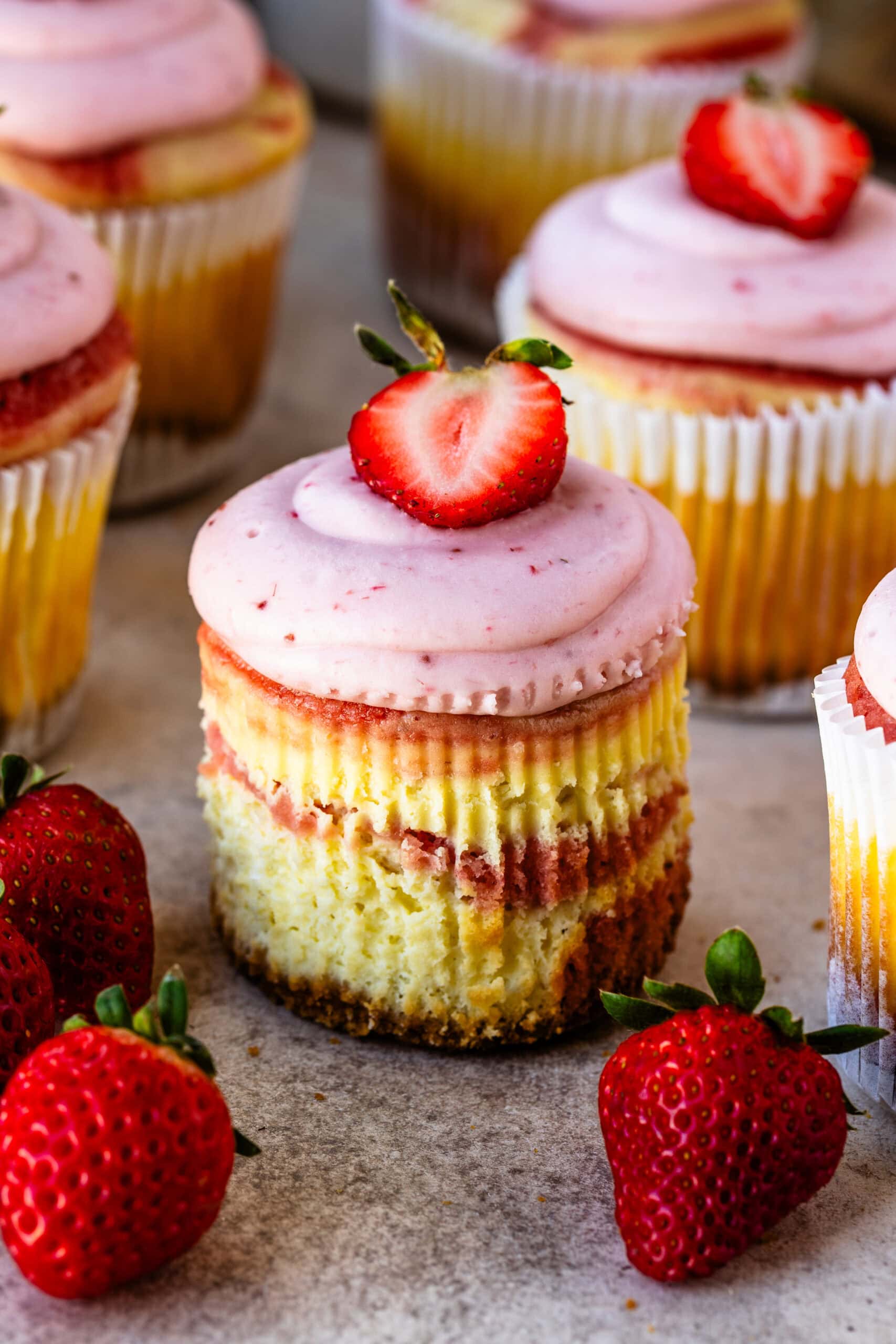 So here they are: strawberry cheesecake cupcakes made with layers of fresh strawberry cake batter and creamy cheesecake batter, baked on top of a graham cracker crust, and finished with a strawberry cheesecake frosting. If you loved my Strawberry Cheesecake, youโll love this recipe.