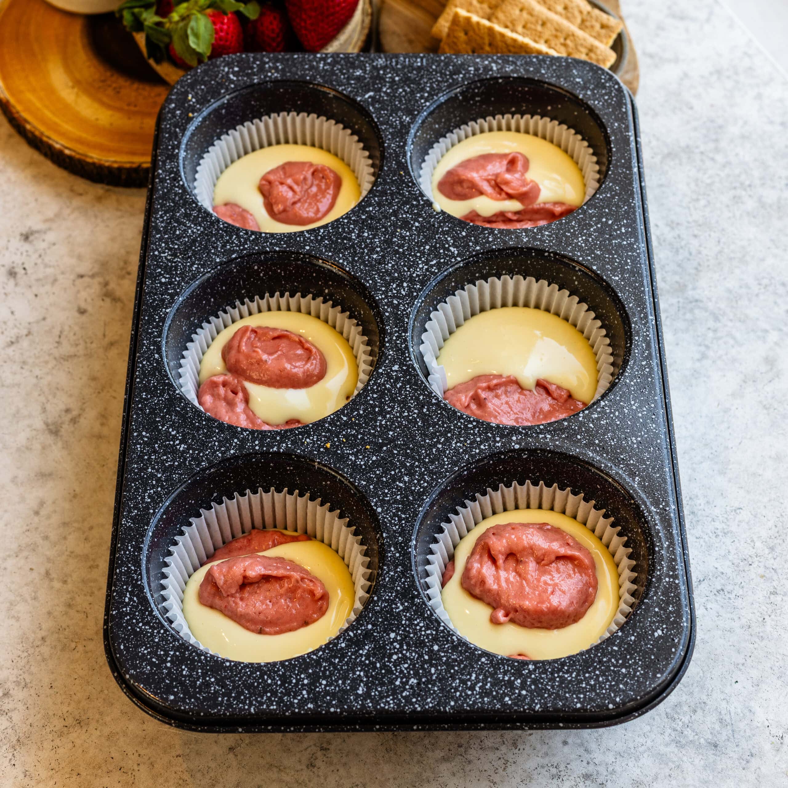I add a couple of tablespoons of strawberry batter into each cavity over the crust. Then cheesecake batter. Then the strawberry again. Fill each cavity about ยพ full.