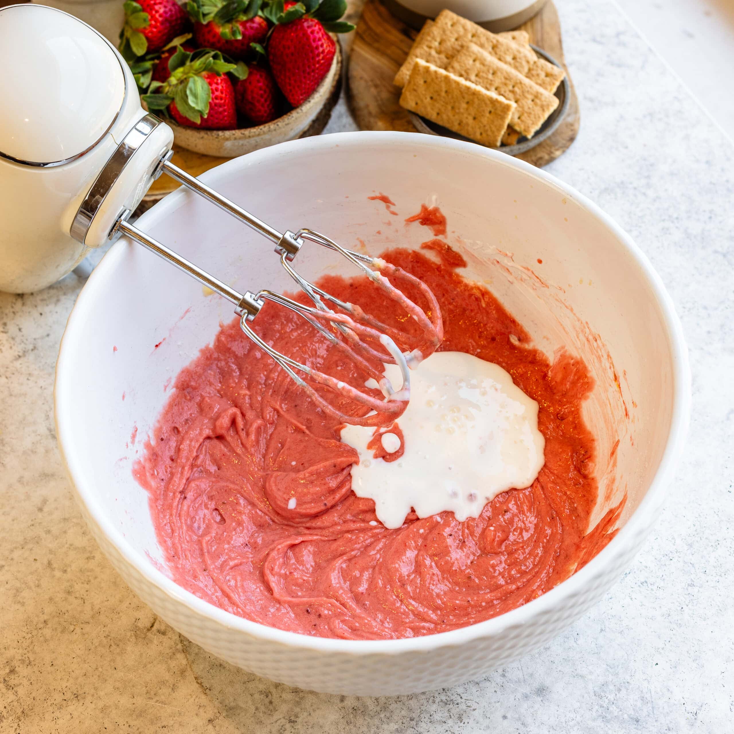 - Add the sour cream, and 1/4 cup of the strawberry puree in the bowl and mix. You can place the remaining strawberry puree in the fridge, covered, to use in the frosting later.