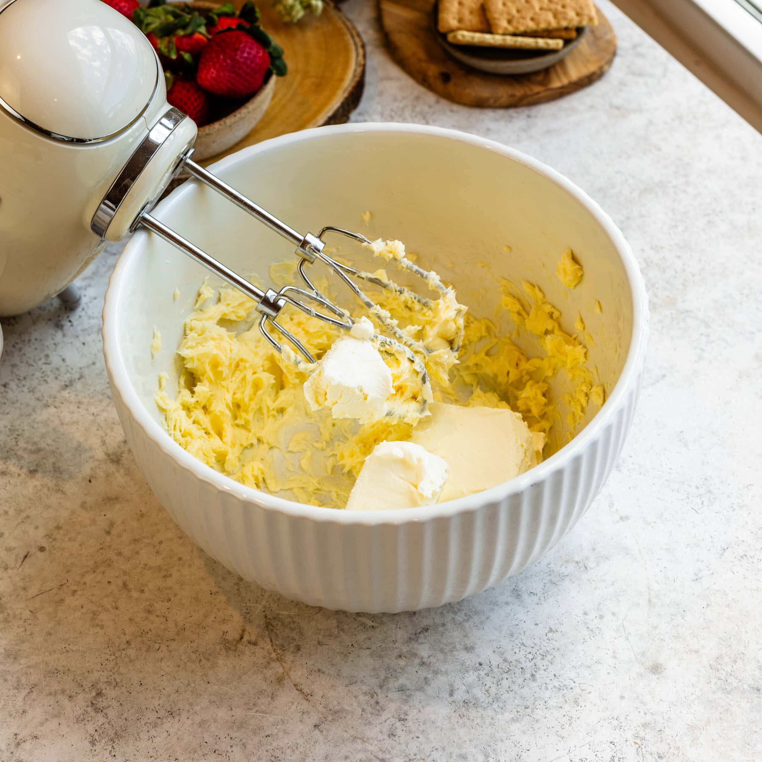 - Beat the butter in the bowl of a mixer for 30 seconds. Add the cream cheese and beat for another 30 seconds on medium-speed.