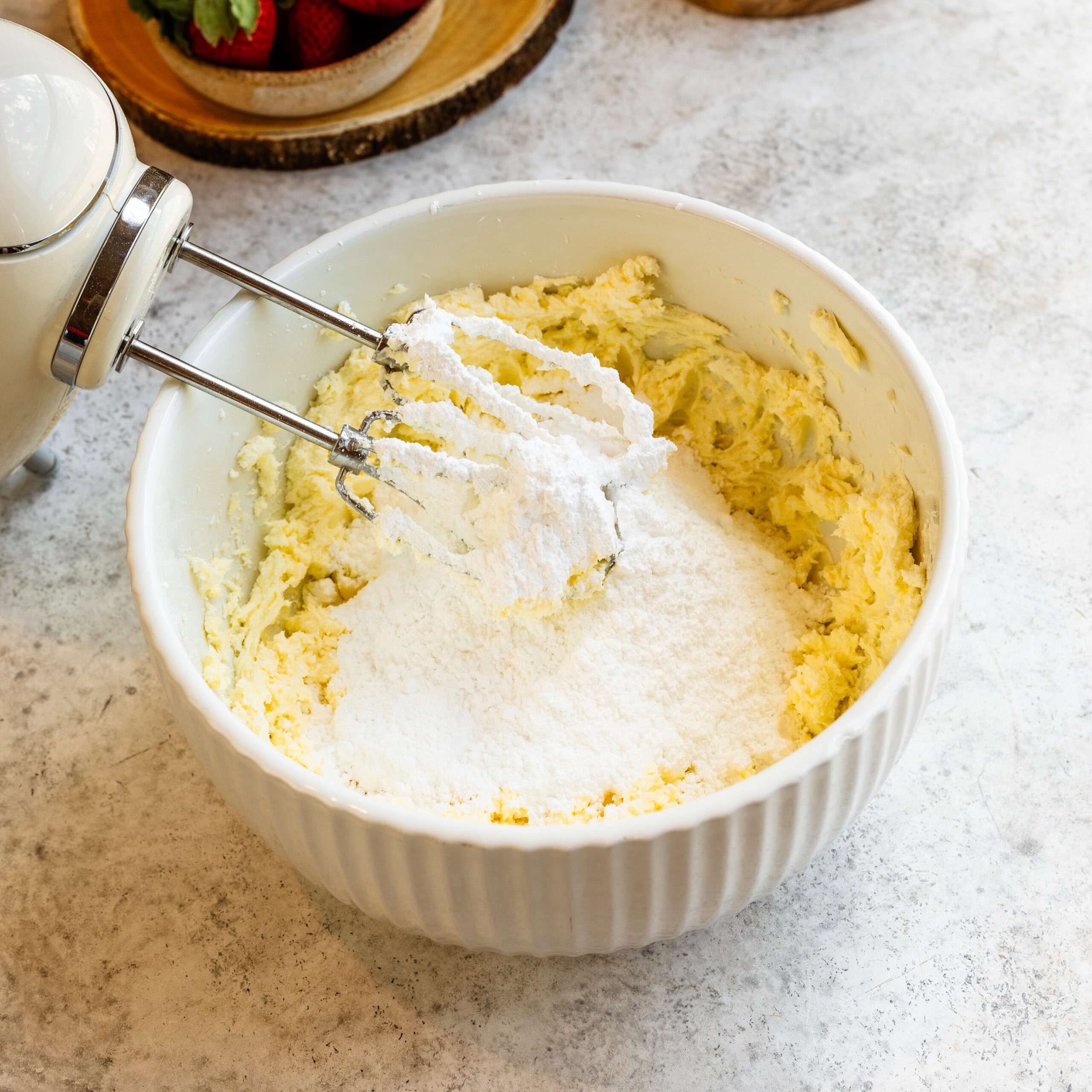 I add the powdered sugar in two different additions to prevent it from flying everywhere!