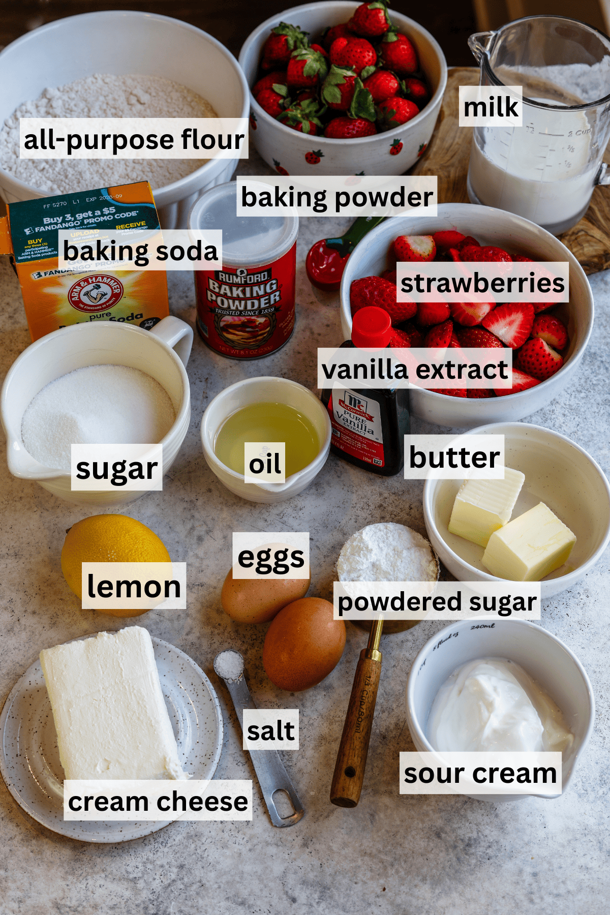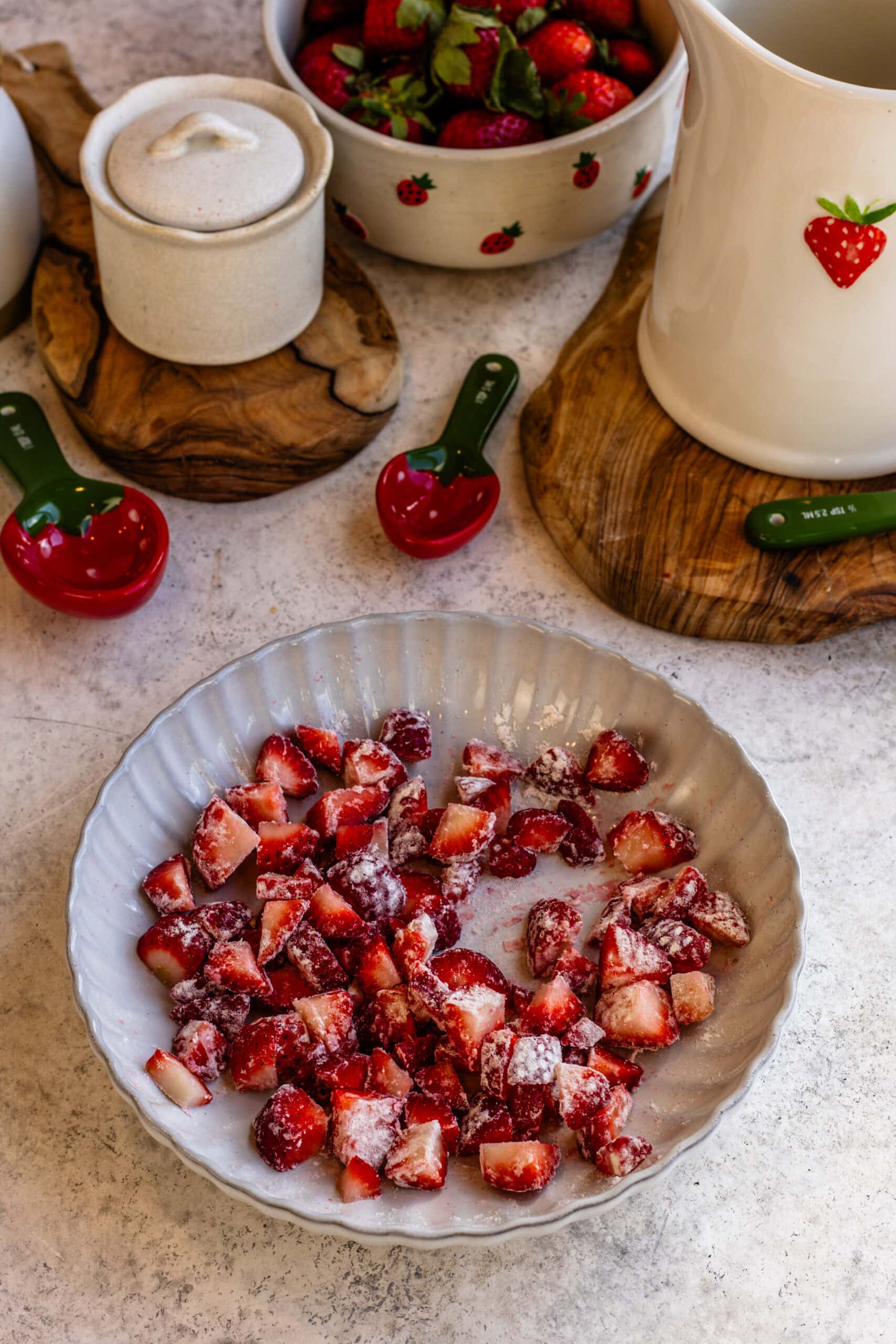 - Fresh strawberries โ These add texture and bursts of fruit, but I coat them lightly in flour so they donโt sink. I prefer using fresh berries whenever possible.