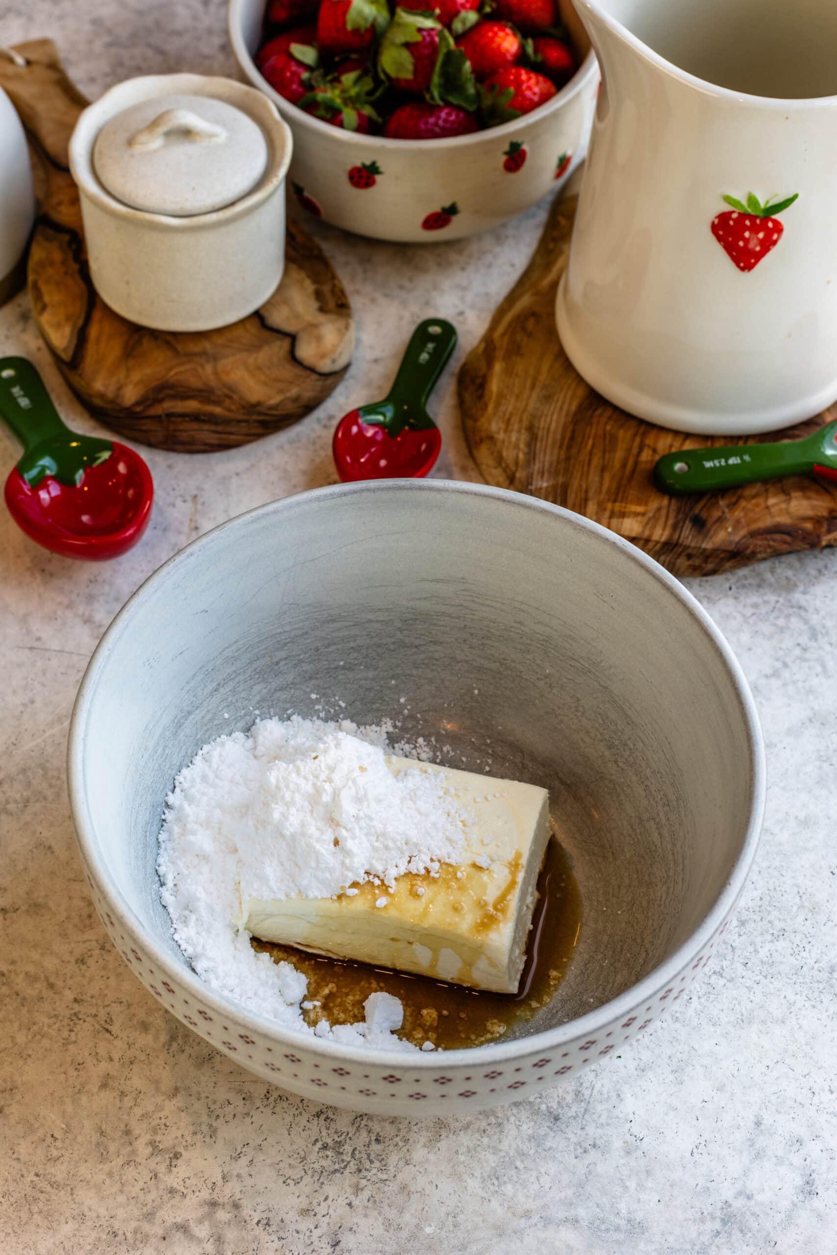 - Beat the cream cheese, powdered sugar, and vanilla in a small bowl with an electric mixer for about 30 to 60 seconds, until completely smooth. Cover with plastic wrap to prevent a skin from forming. Set aside (refrigerate if your kitchen is warm).