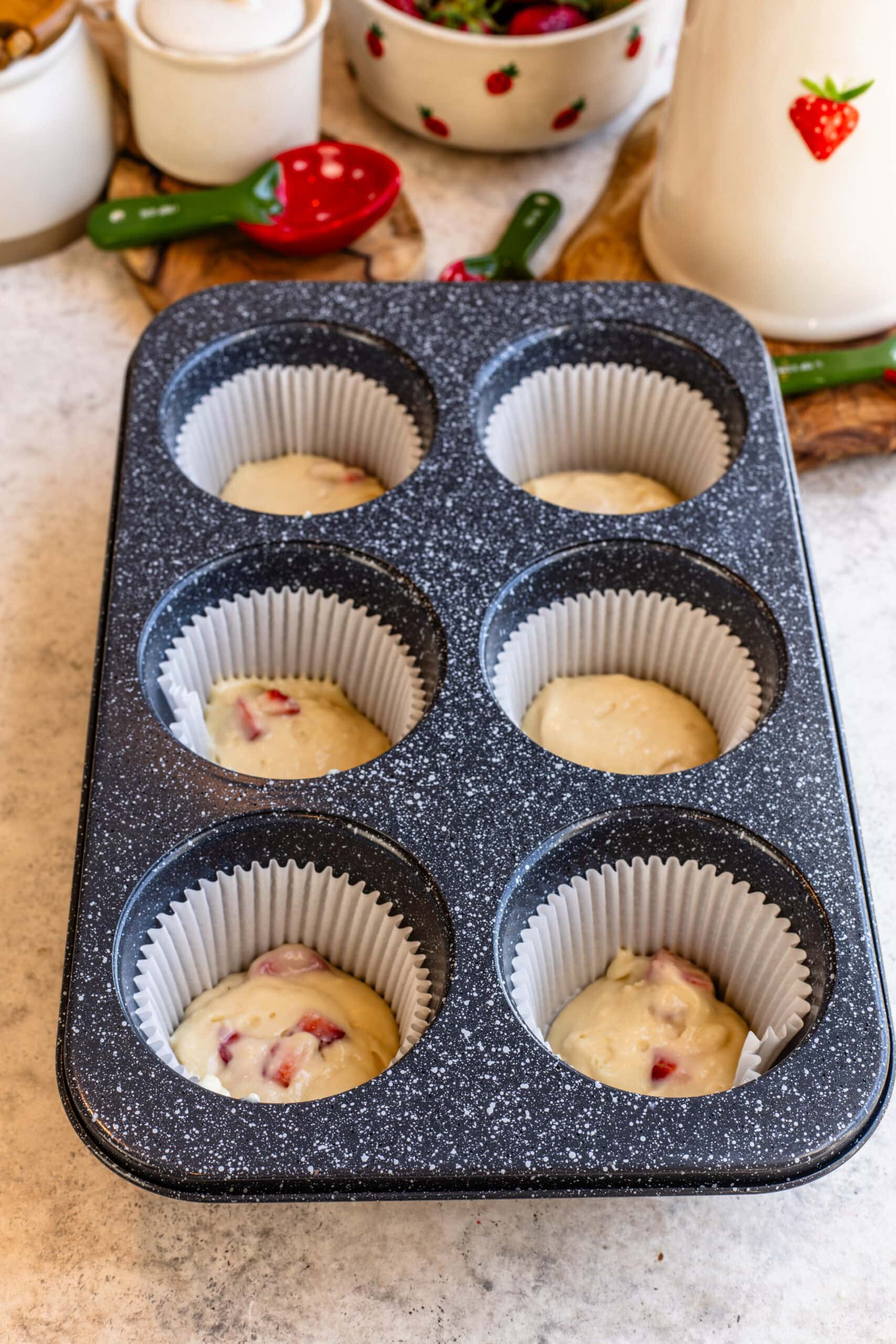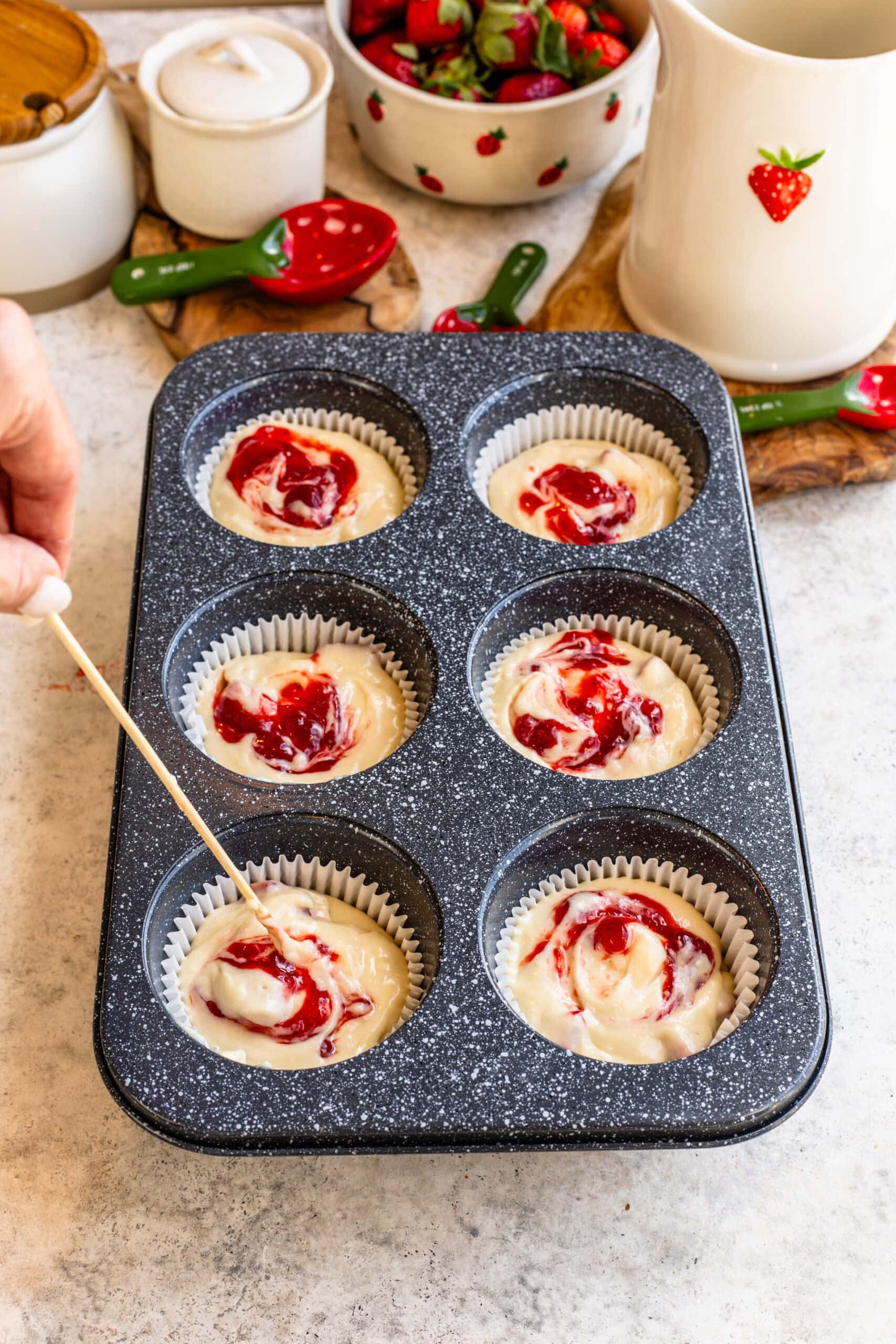 - Add ยฝ teaspoon of the strawberry reduction over the batter (1 teaspoon for jumbo muffins) and gently swirl with a toothpick.